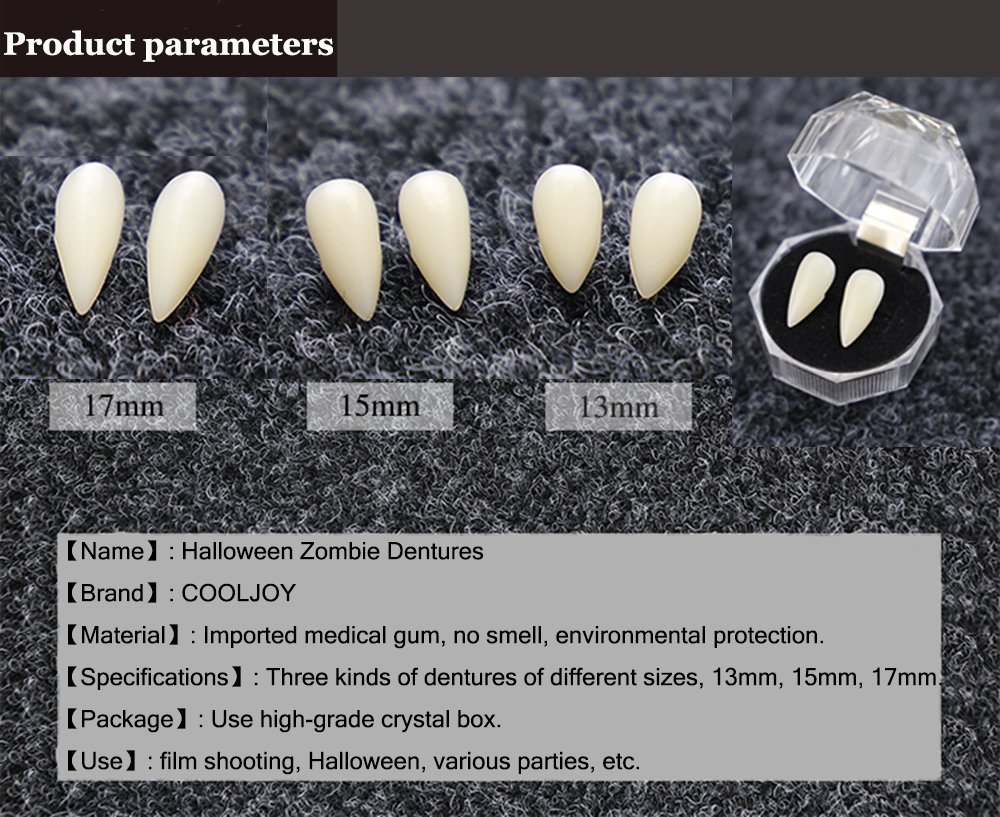 📦 Comprehensive Package: Includes three sizes of vampire teeth—13mm, 15mm, and 17mm, you can choose to use the size you want, —plus two tubes of teeth adhesive pellets, no separate purchase necessary.