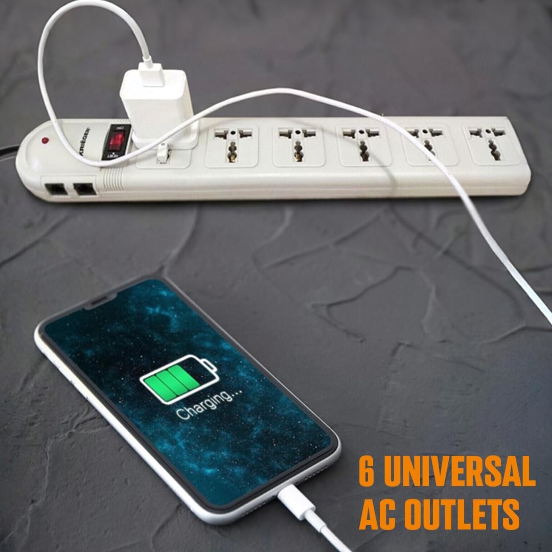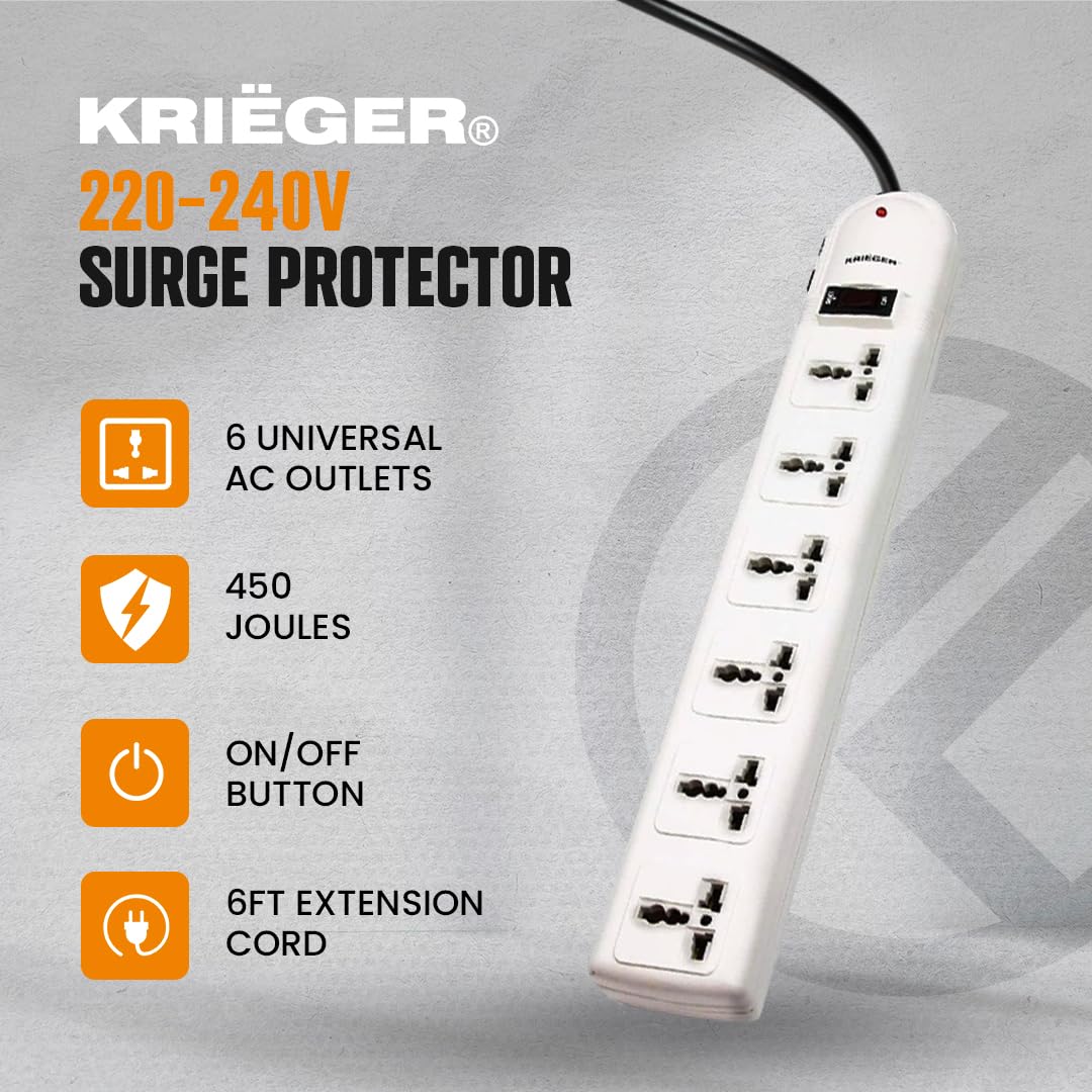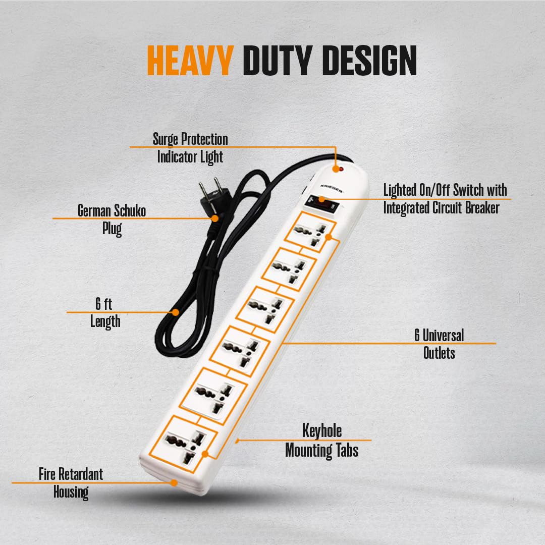 6 Universal outlets, 6 ft in Length, 450 joules AC surge suppression shields equipment from surges and line noise