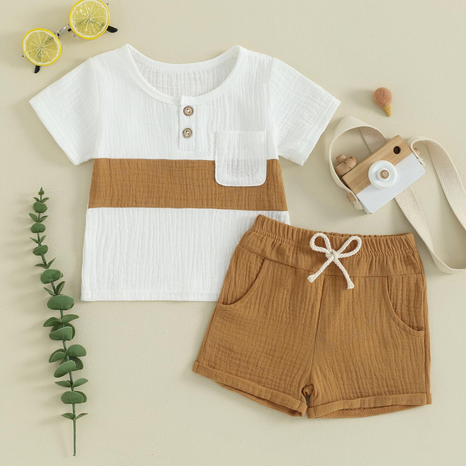 Features: Baby boy short sleeve henley shirt, front button with chest pocket, matching with elastic waist solid color shorts, 2pcs fashion boys summer clothes makes your boys handsome.