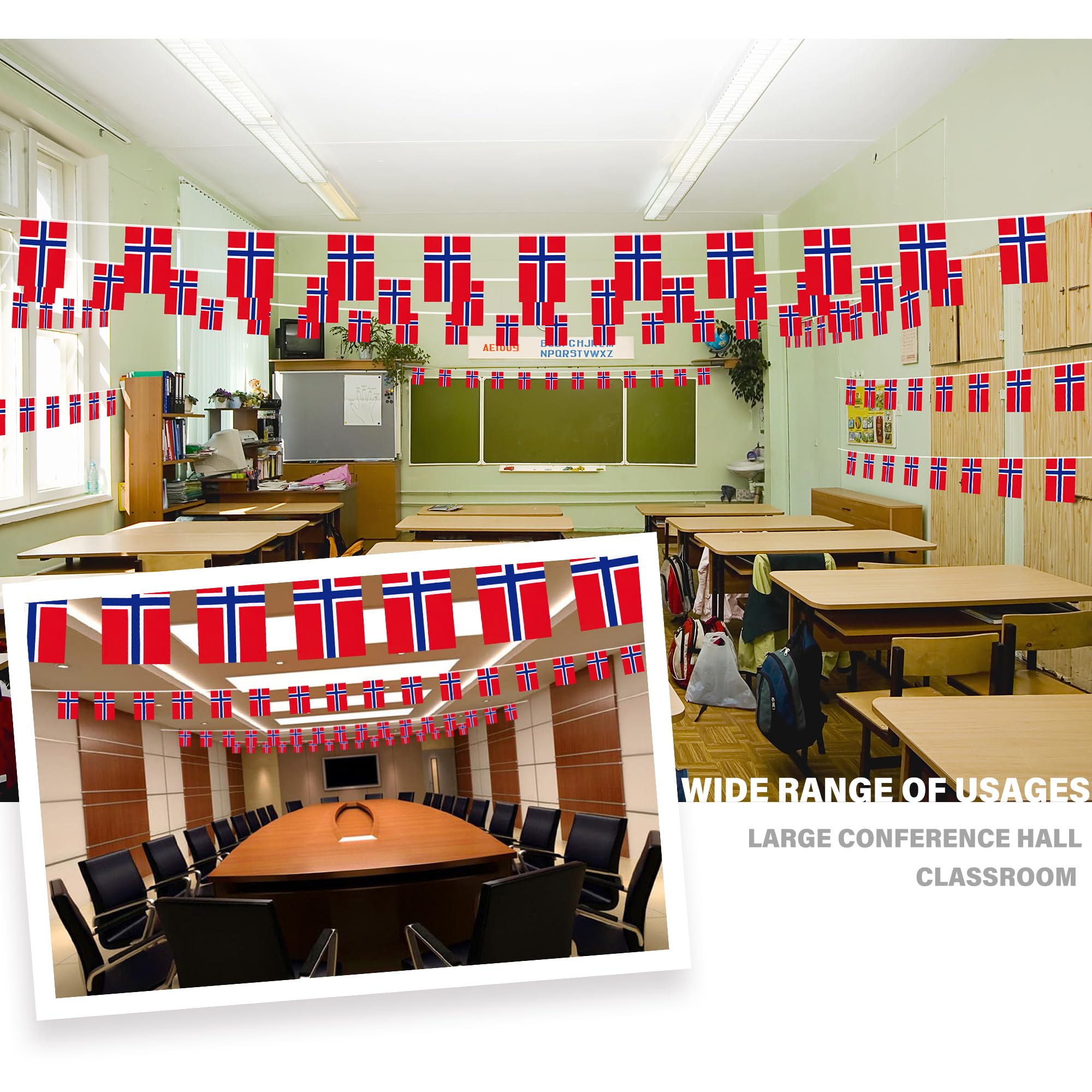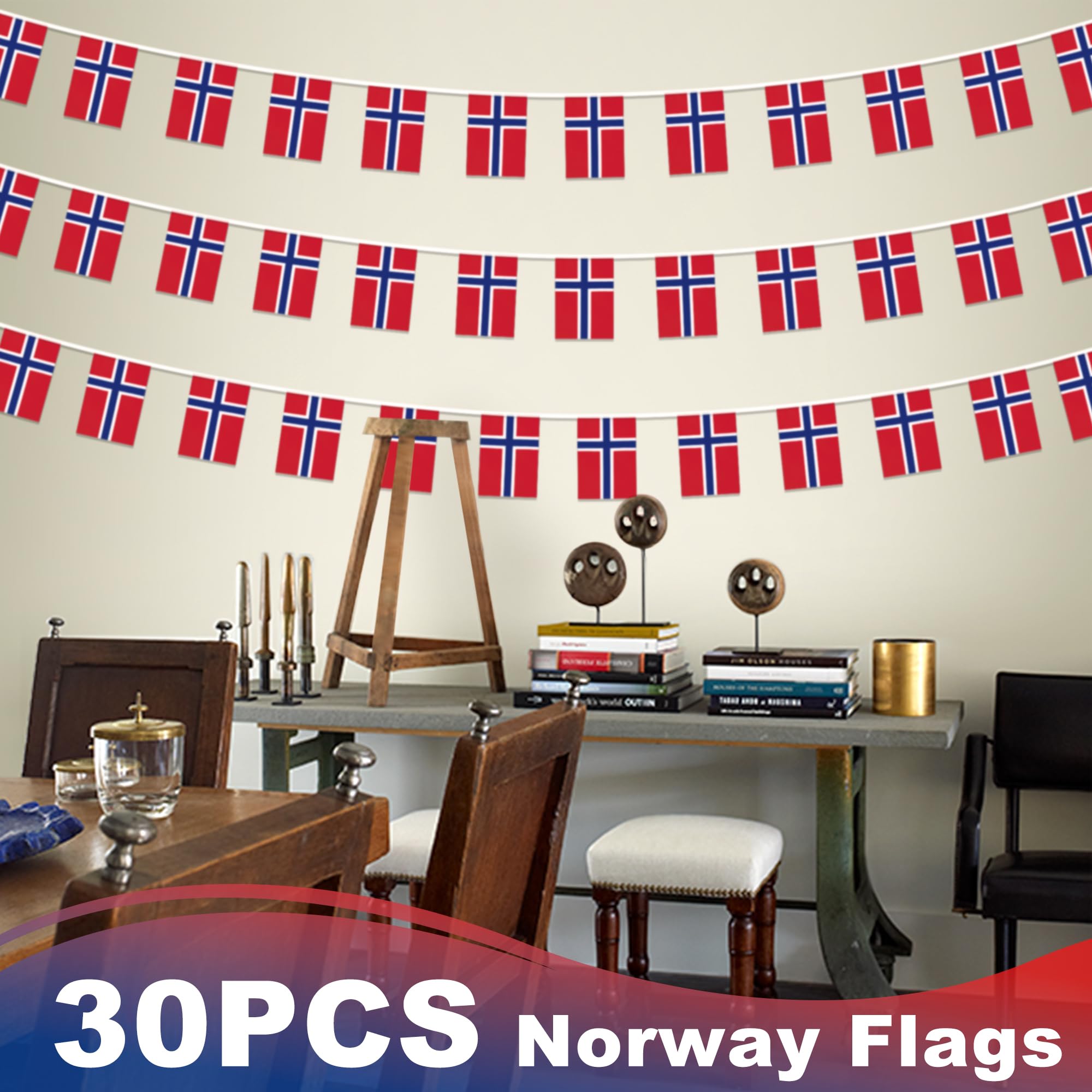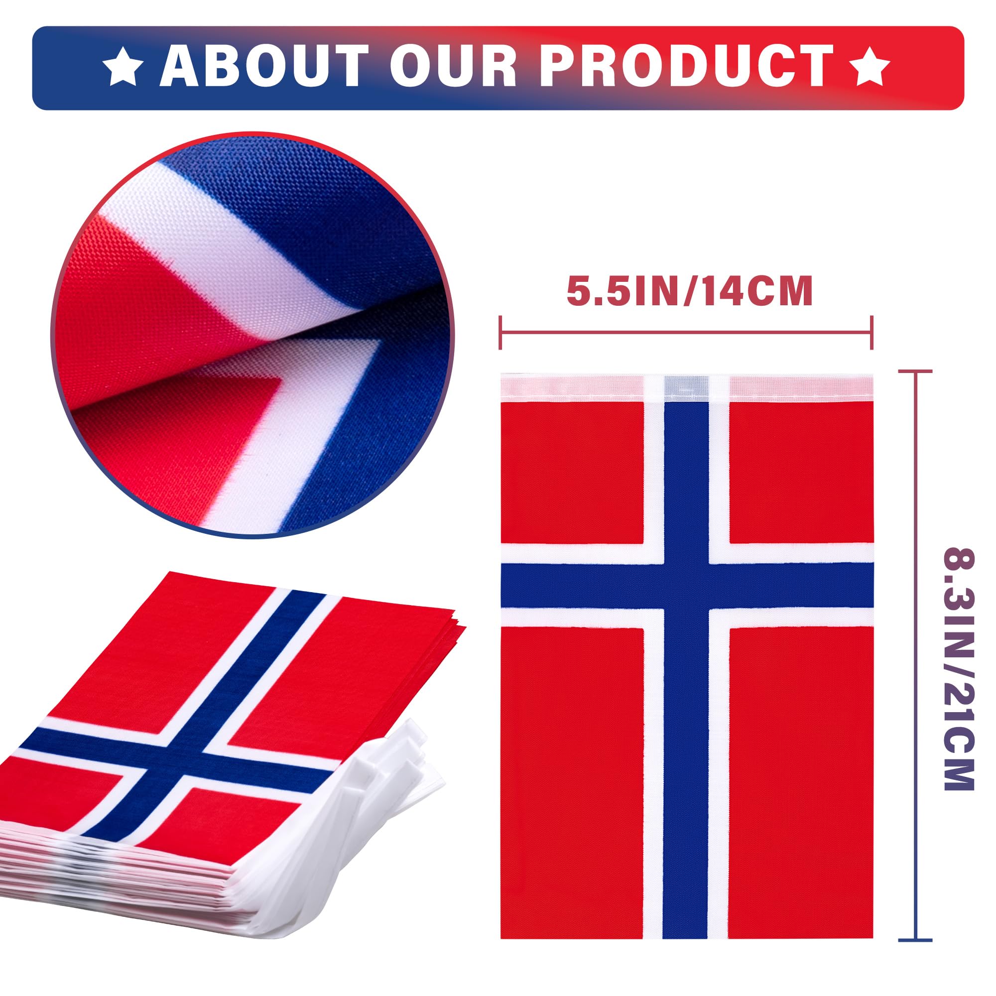 【Specifications】Each string is approximately 33 feet long. Includes 30 pcs Norwegian Nordmann flags. Each flag is approximately 5.5 in wide and 8.2 in long.
