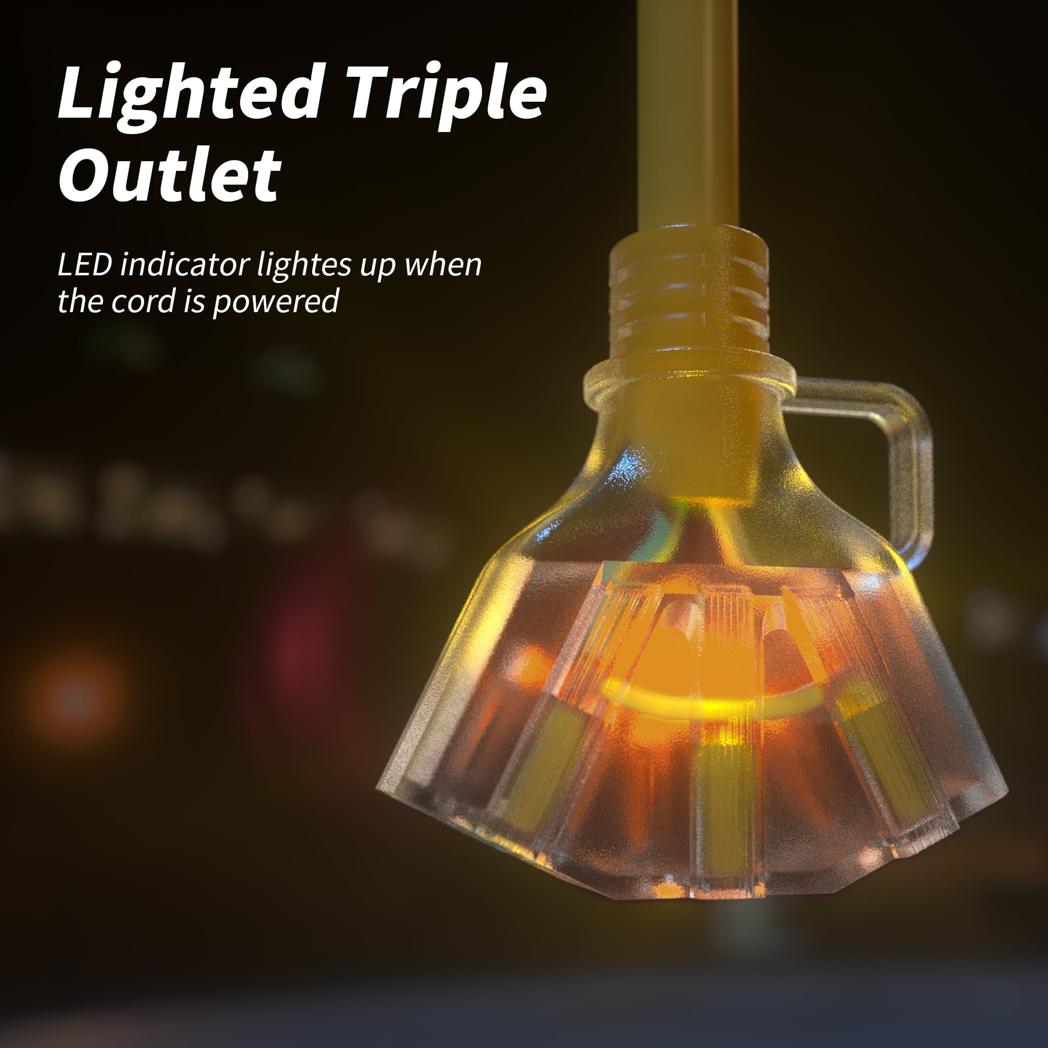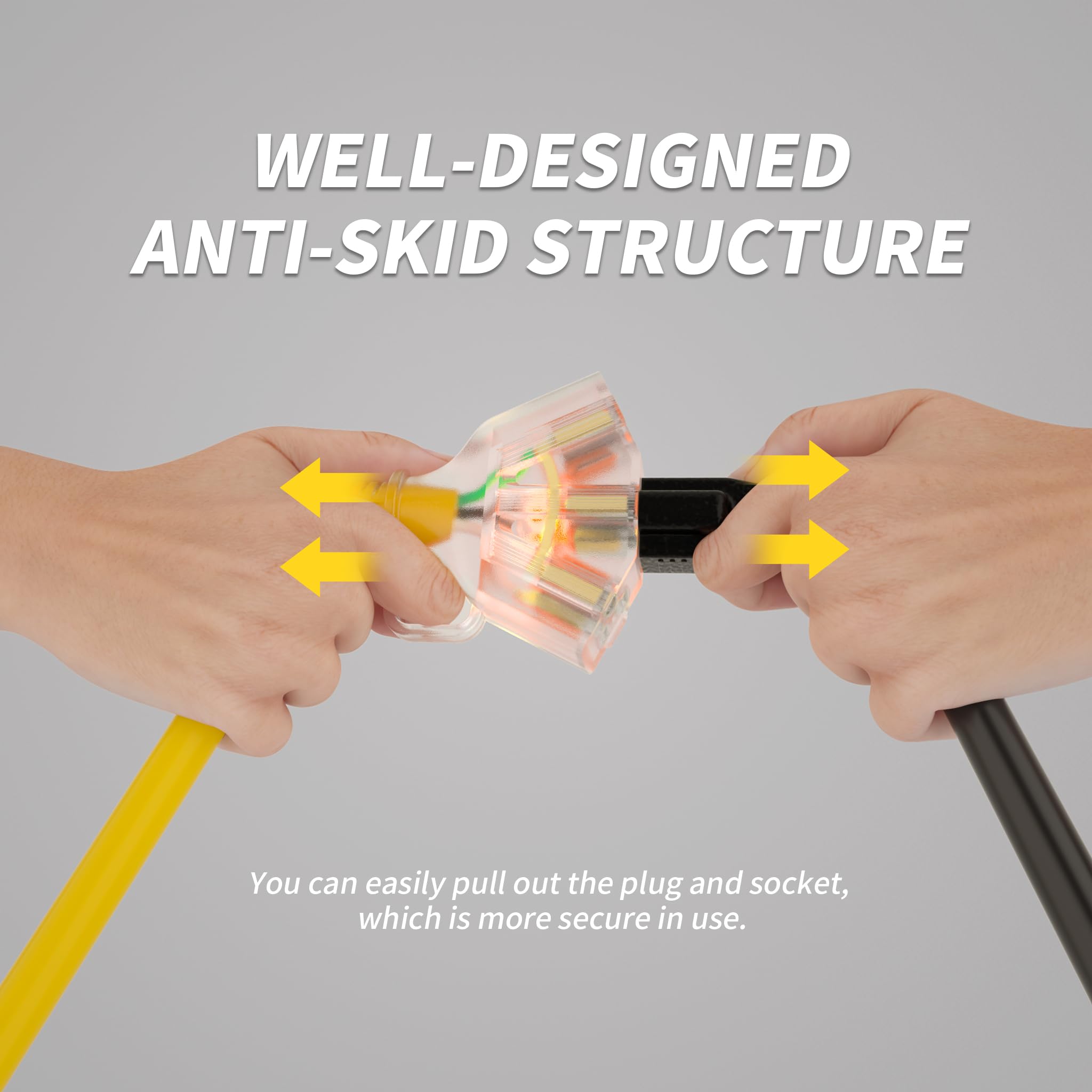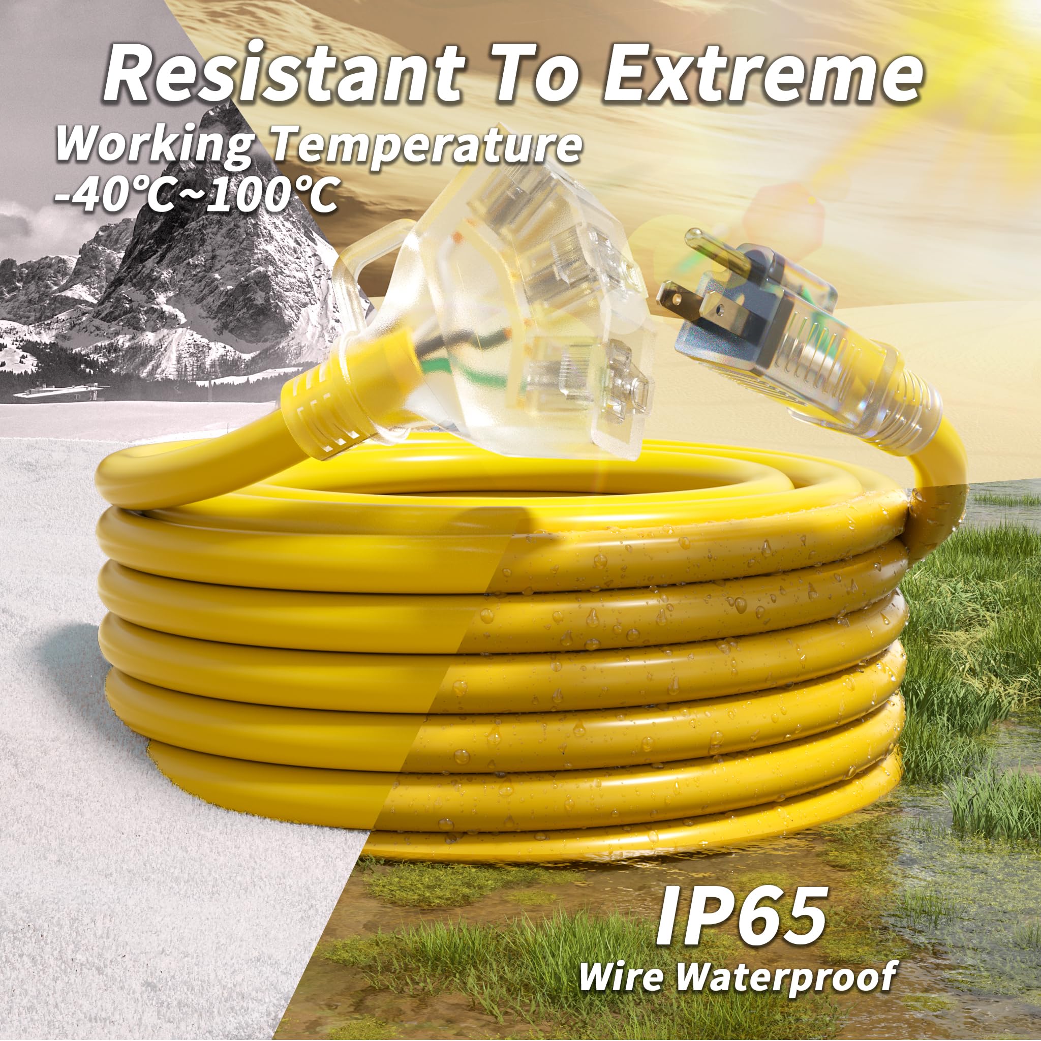 Durable and weatherproof: The 3 plug extension cord outdoor have SJTW jacket; Rugged for temperatures from -40°F to 140°F and IP65 waterproof; 3 way extension cord splitter outdoor will not break or deteriorate even under harsh conditions; 3 way plug adapter outdoor body part is soft and flexible; Outdoor heavy duty extension cord 10 gauge can resist wear, waterproof and weatherproof; And it won't damage floors or walls