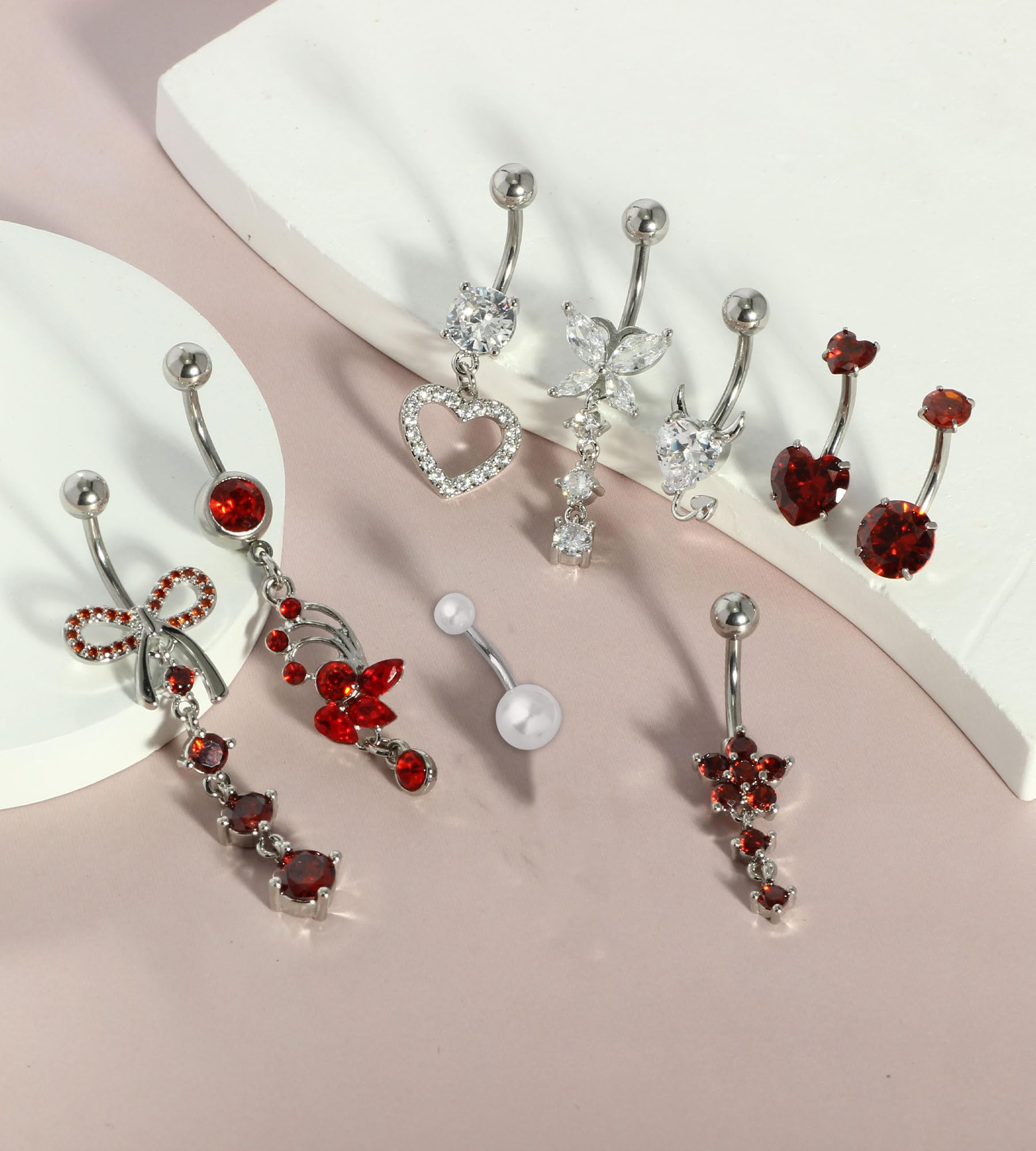 【BELLY PIERCING】: One order includes 9pcs belly button rings:3pcs silver dangle belly button ring, one short belly rings and 4pcs pink belly button rings, flower, butterfly, heart belly button rings set, multiple style to decorate your navel.
