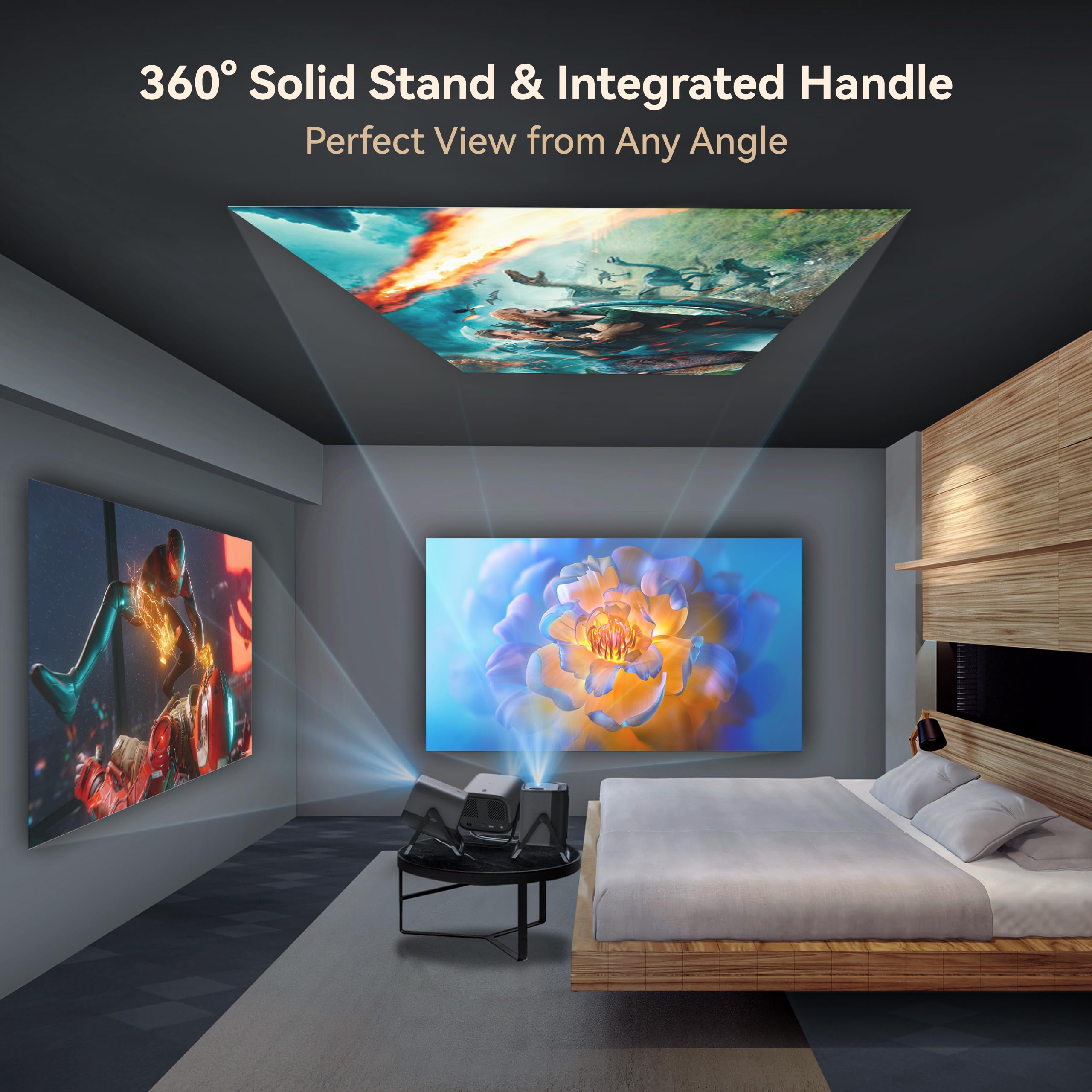 【360° Rotatable Stand with Handle】No need for ceiling mounts or purchasing an extra tripods. Meer updated mini projector features a 360° rotatable design with a solid stand and integrated handle, making it a breeze to adjust to any viewing angle you desire. Experience unparalleled viewing freedom and take this portable outdoor projector anywhere—perfect for cozy movie nights at home or lively outdoor parties. Wherever you are, enjoy top-notch visuals that bring every moment to life.