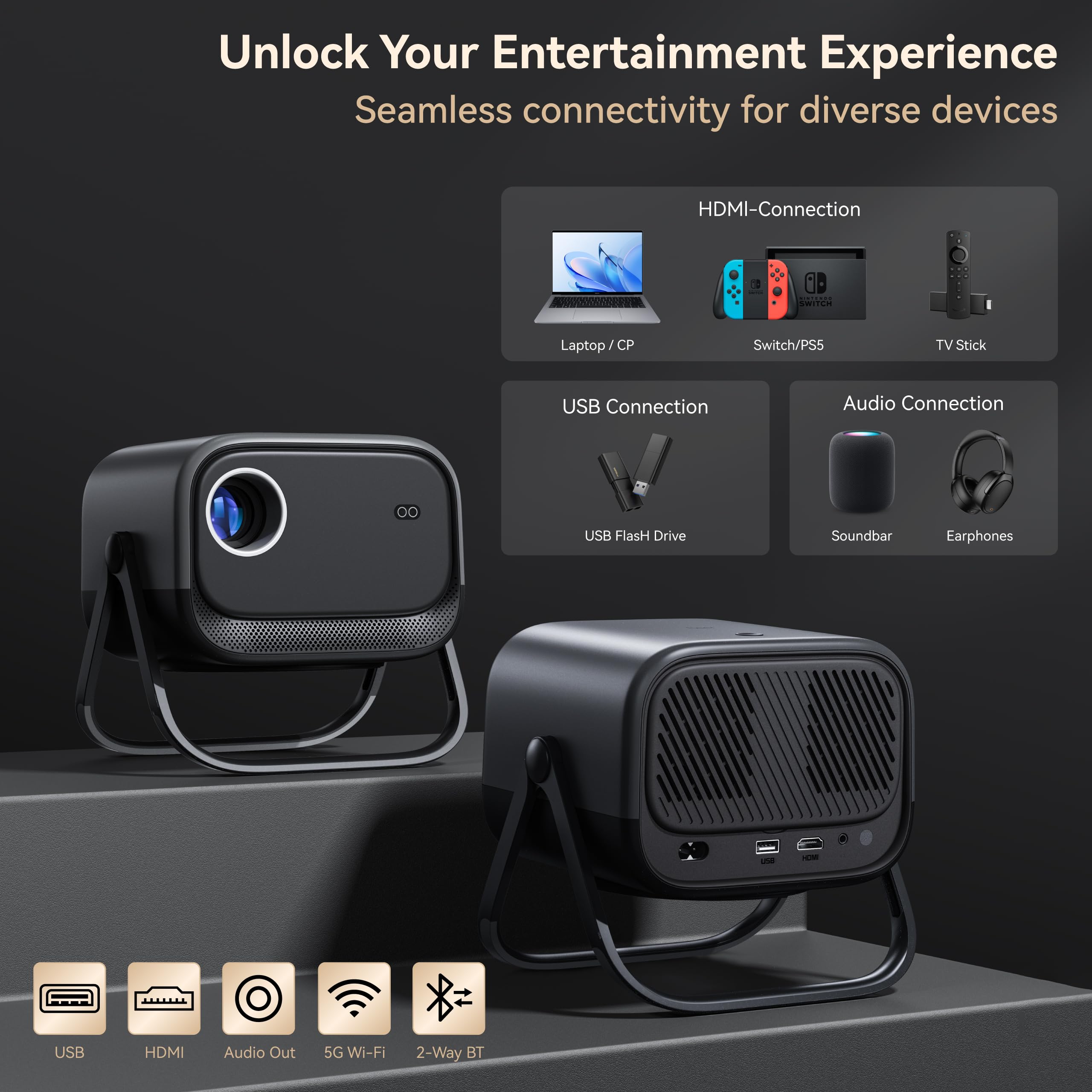 【Superfast 5G WiFi and Bidirectional Bluetooth】The Meer WiFi Bluetooth projector offers dual-band 5G/2.4G WiFi connectivity, effectively avoiding signal interference for a stable connection and fast data transfer. This means smoother, lag-free online video streaming every time. With dual-direction Bluetooth, it seamlessly transforms into a standalone speaker for your phone or connects stably to external Bluetooth speakers, delivering a more powerful and immersive audio experience.