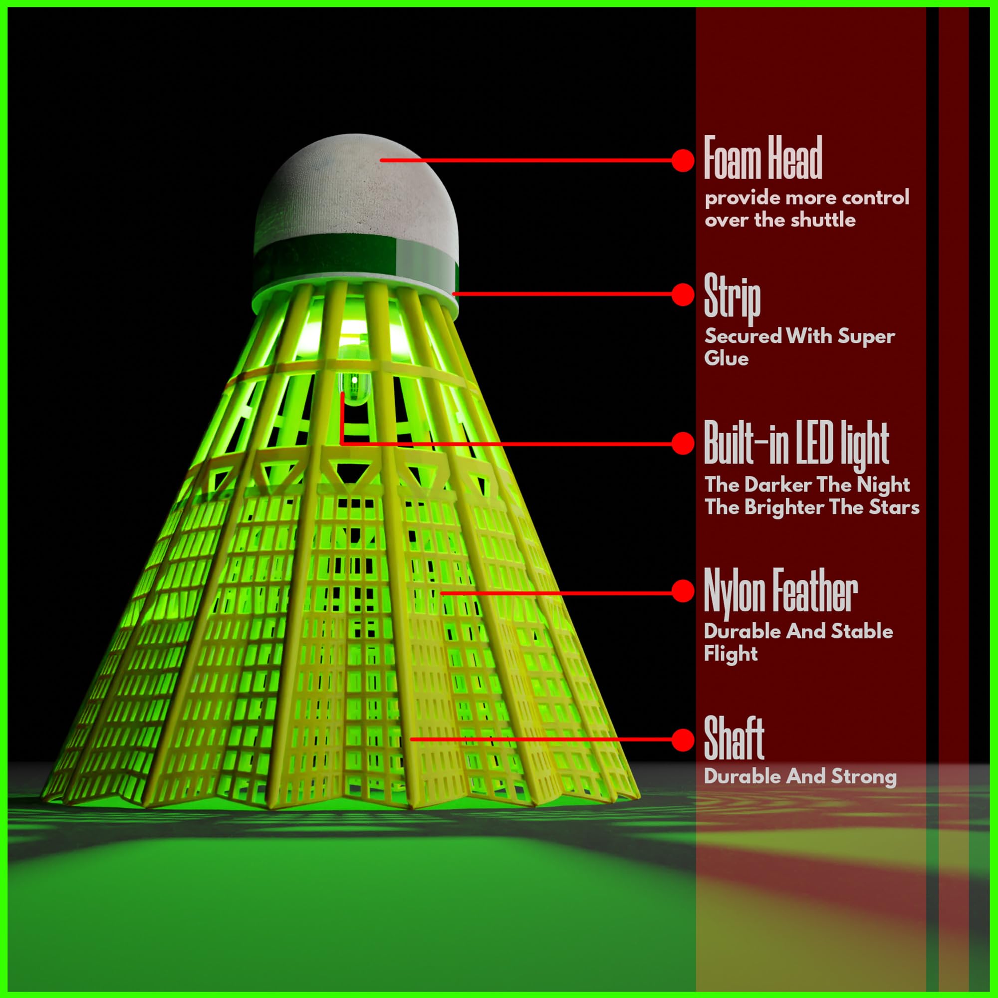 LED Shuttlecocks: Equipped with high quality and long lasting LEDs. 1x Red, 1x Blue, 1x Green, 1x White & 1x alternates between three colors glow in the dark birdies.