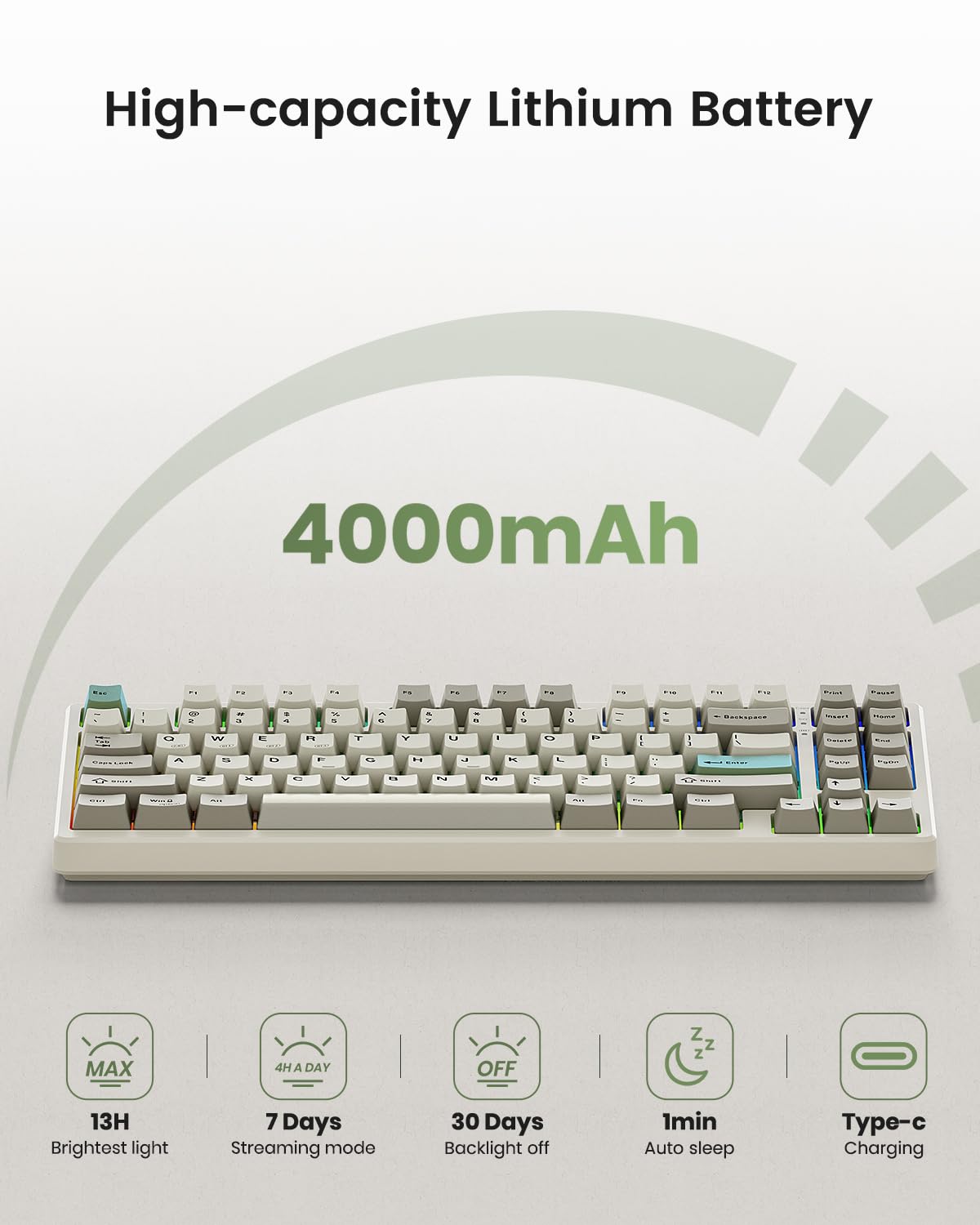 【Connect How You Like】Experience unparalleled versatility with our tri-mode connection gaming keyboard: Bluetooth 5.0, 2.4G wireless and wired USB-C. The wired mode is more efficient and stable, plug and play. Cable-free brings you more convenience, it seamlessly switches between different devices and systems with minimal latency, the wireless mechanical keyboard comes with a robust 4000mAh rechargeable battery