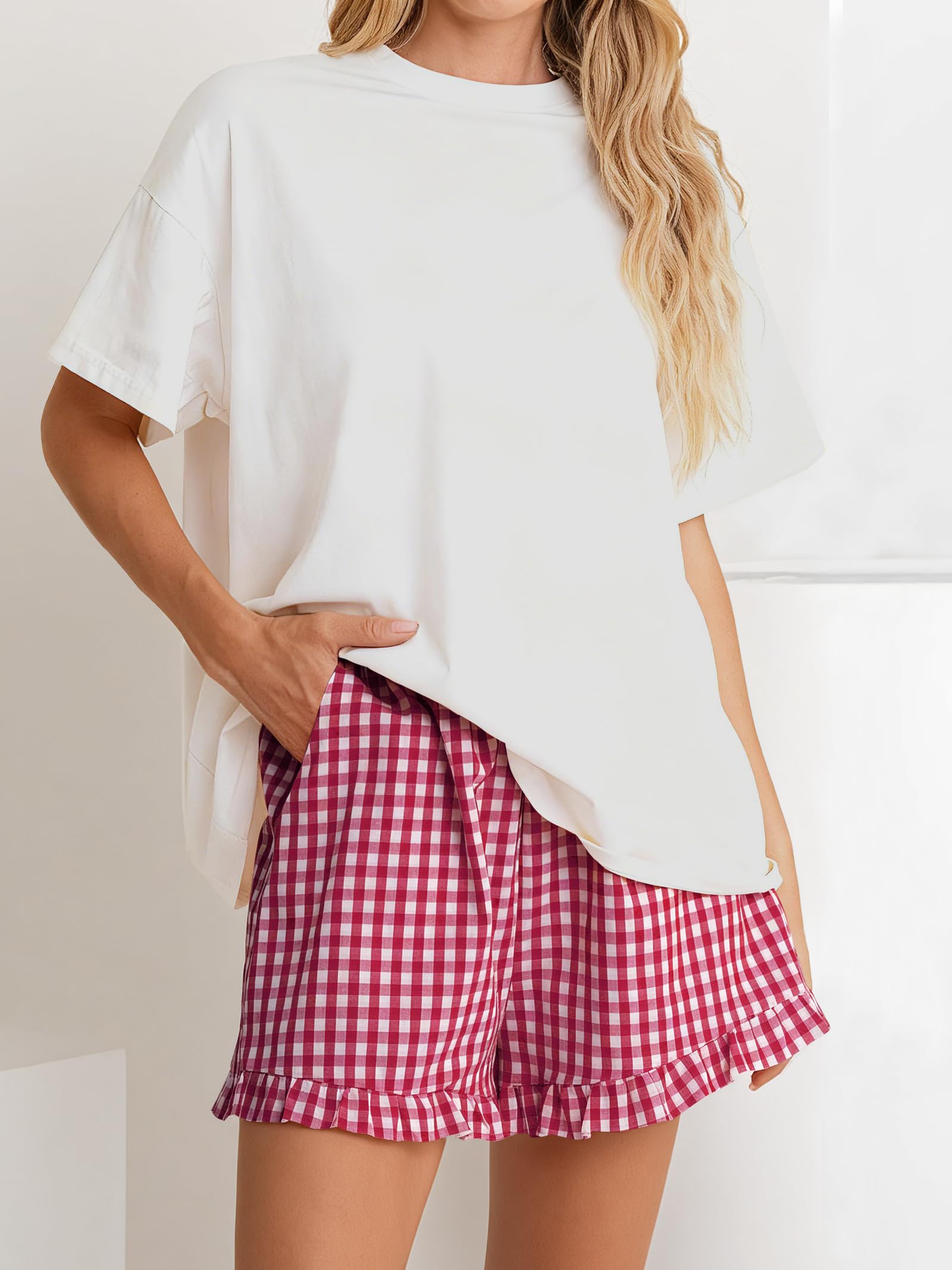 Features - Women's summer pajama bottoms, boxer shorts with pockets, ruffle, plaid design, elastic waist, soft and breathable. This womens short perfect for daily wear, home, workout, beach, travel.
