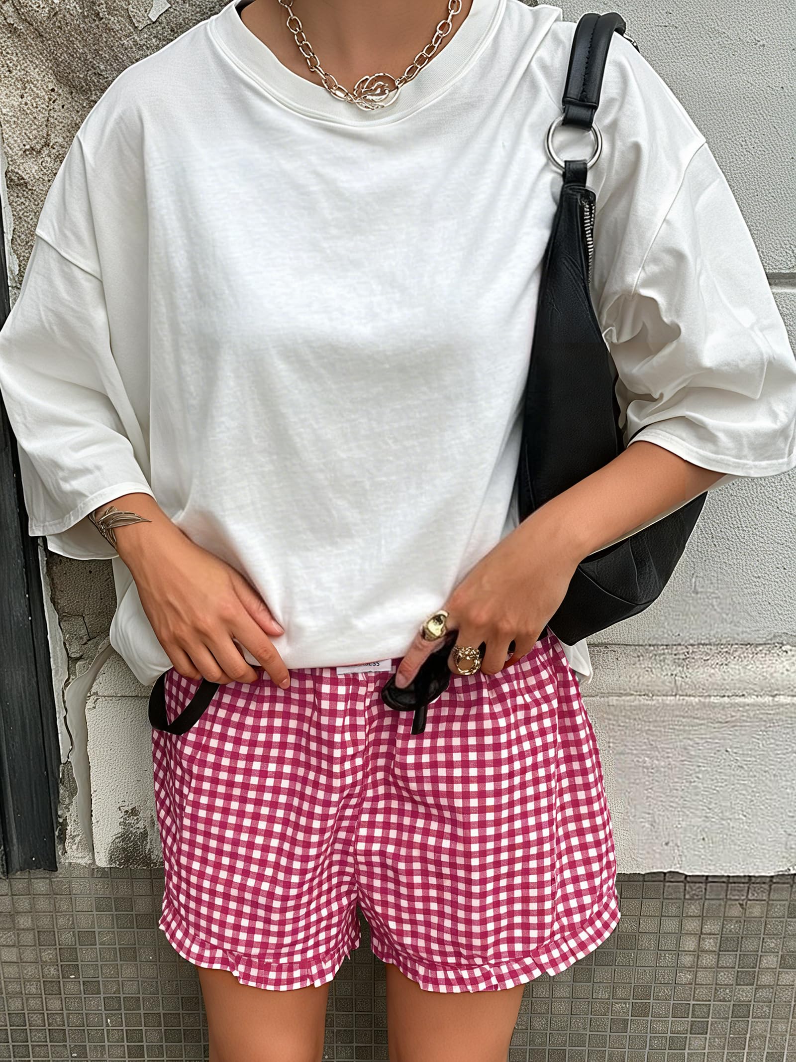 Material - 100% Rayon. Stretch - Non, Thickness - Thin, Softness - Medium. Machine wash cold gently with like colors. Do not bleach.Ironing temperature should not exceed 110°C. Our stylish high-waisted gingham lounge Shorts for spring summer and autumn! Featuring a plaid and stretchy waistband, pair them with your favorite crop tops, sweaters, or tees to rock the perfect trendy girl look.