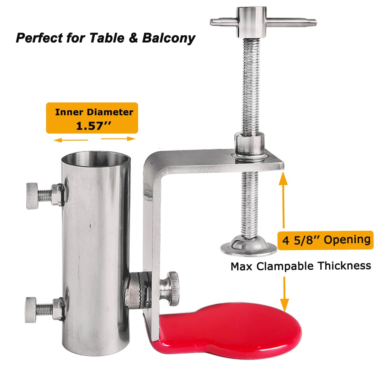 ▶ Heavy-Duty Clamp --- 1.57" Inner diameter tube with double thumbscrews to hold the umbrella securely, fits umbrellas that are less than 1 9/16" in outer diameter. Features upgraded stainless steel gears + rubber-padded jaws that grip surfaces max clampable 4 5/8'' thickness;