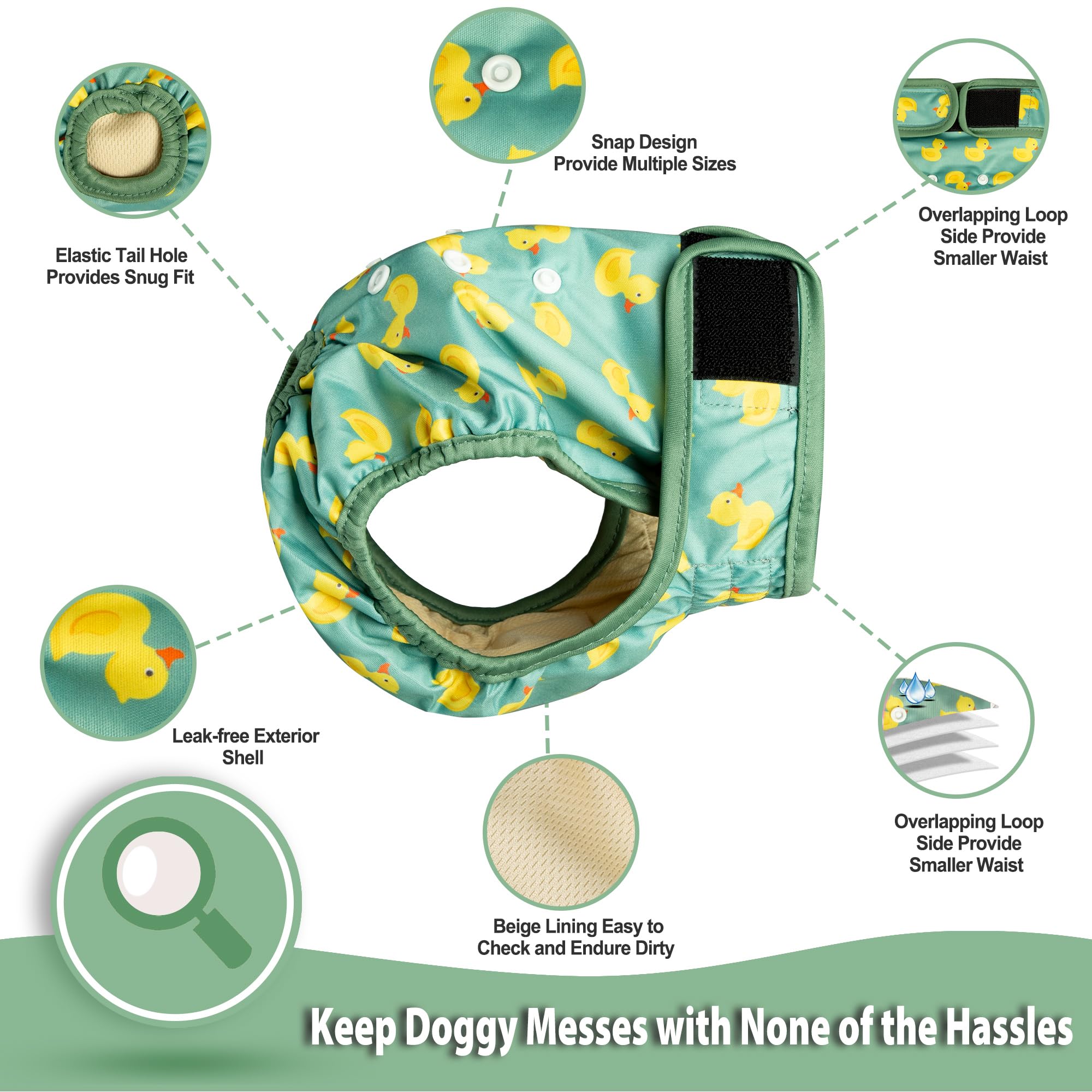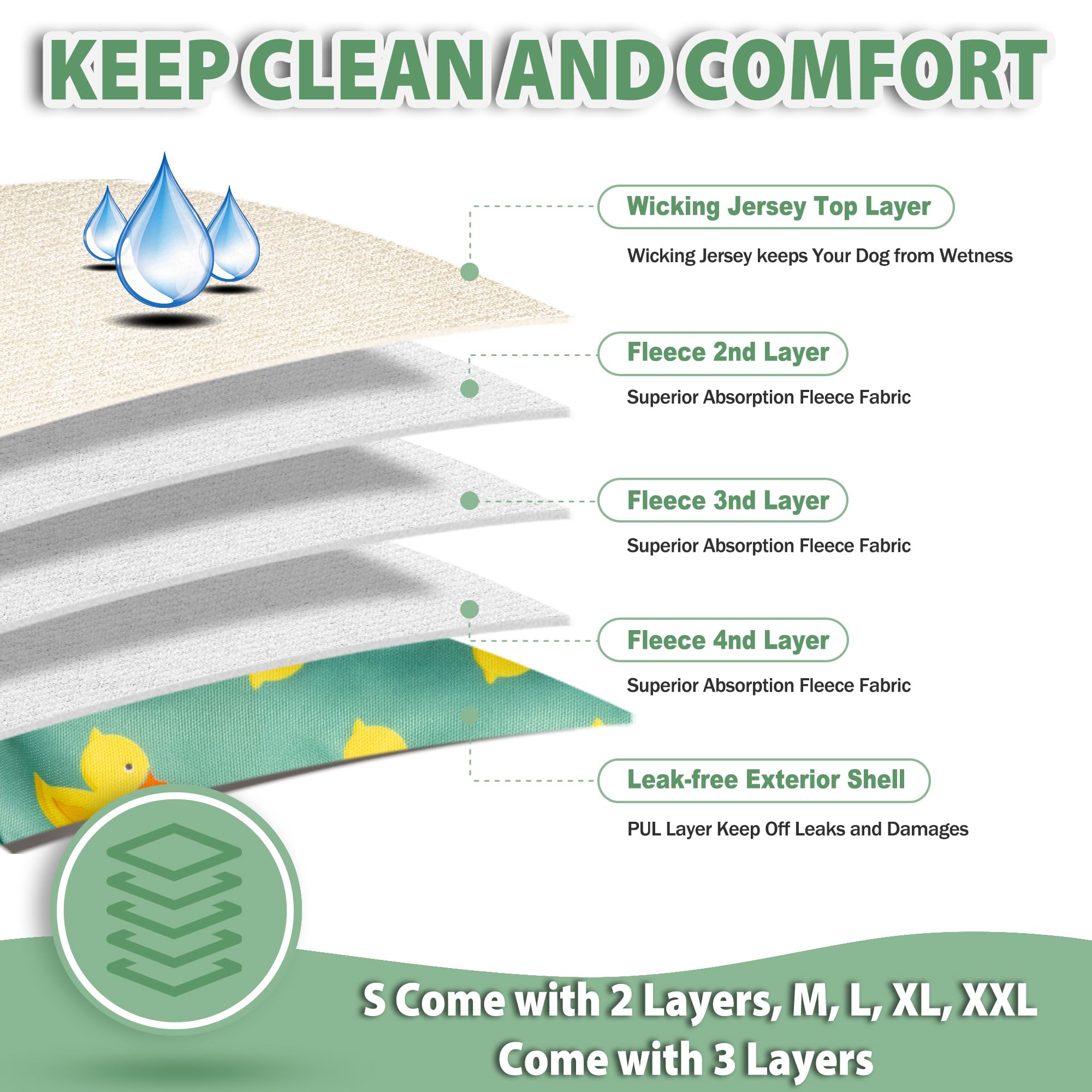 Absorbent & Leak-free Materials - The reusable female dog diaper inner layer is made of soft and breathable beige color wicking jersey, perfect to keep the dog from wetness. The 3 middle layers are made of highly absorbent fleece to absorb the liquid and stop any leaks.The diaper outer layer, with attractive and fun designs, is made of smooth and soft-to-touch leak-free TPU material to keep the floor or bed dry and clean.