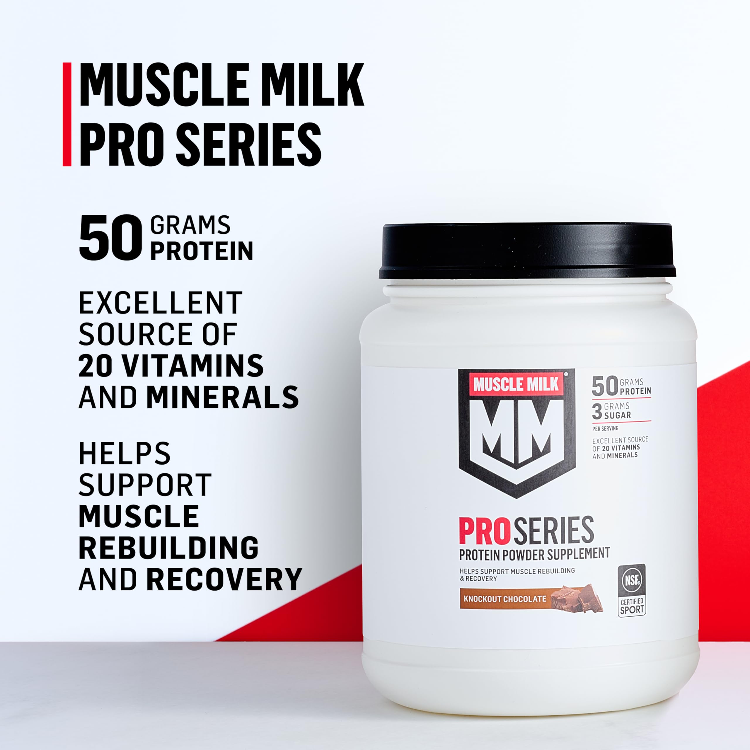 Muscle Milk Pro Series Protein Powder Supplement, Knockout Chocolate, 2 Pound, 11 Servings, 50g Protein, 3g Sugar, 20 Vitamins & Minerals, NSF Certified for Sport, Workout Recovery, Packaging May Vary