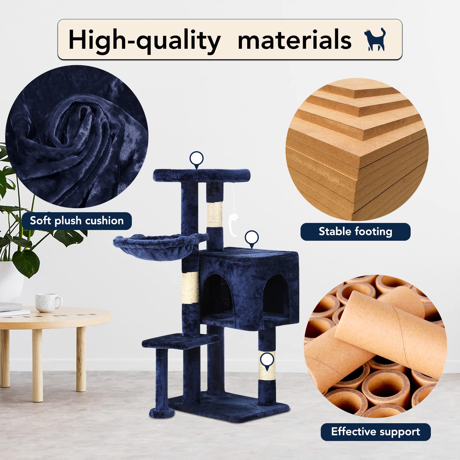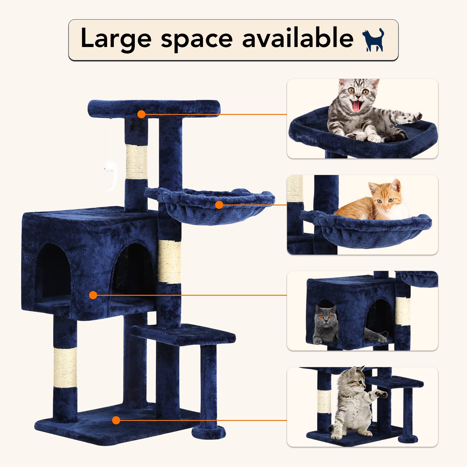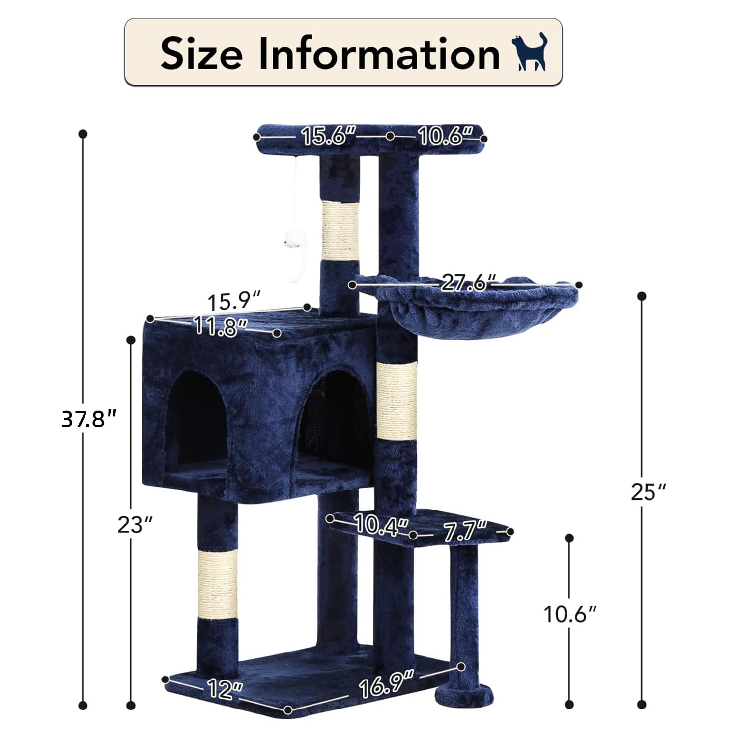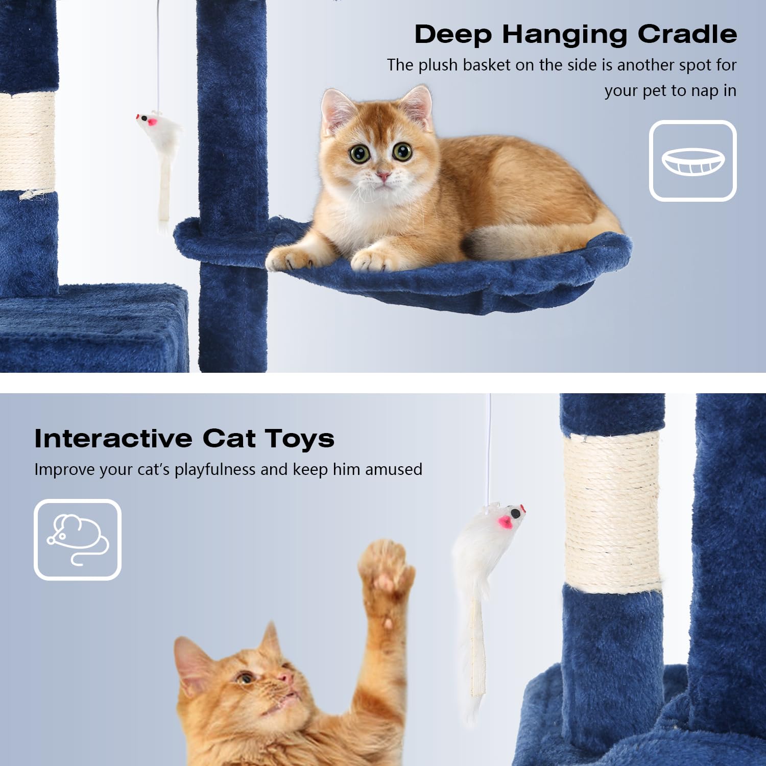 MULTI-LEVEL CAT TREE TOWER: Featuring a soft plush perch, sisal scratching posts, a relaxing hammock, and hanging cat toy, this cat tree keeps your kitty active, entertained, and happy indoors.