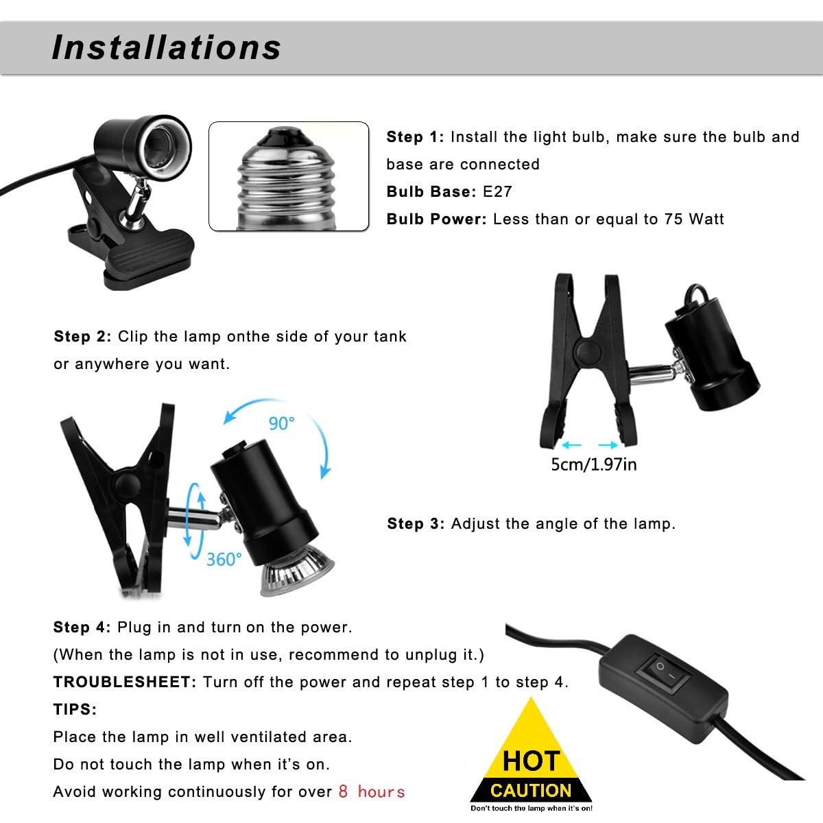 【Package】 Includes 1 * Heat Lamp , 1 * 50W E27 socket Bulb (3000+ hours life certification). Cord length approx 4.59 FT. Clip opening up to 1.97 inch.