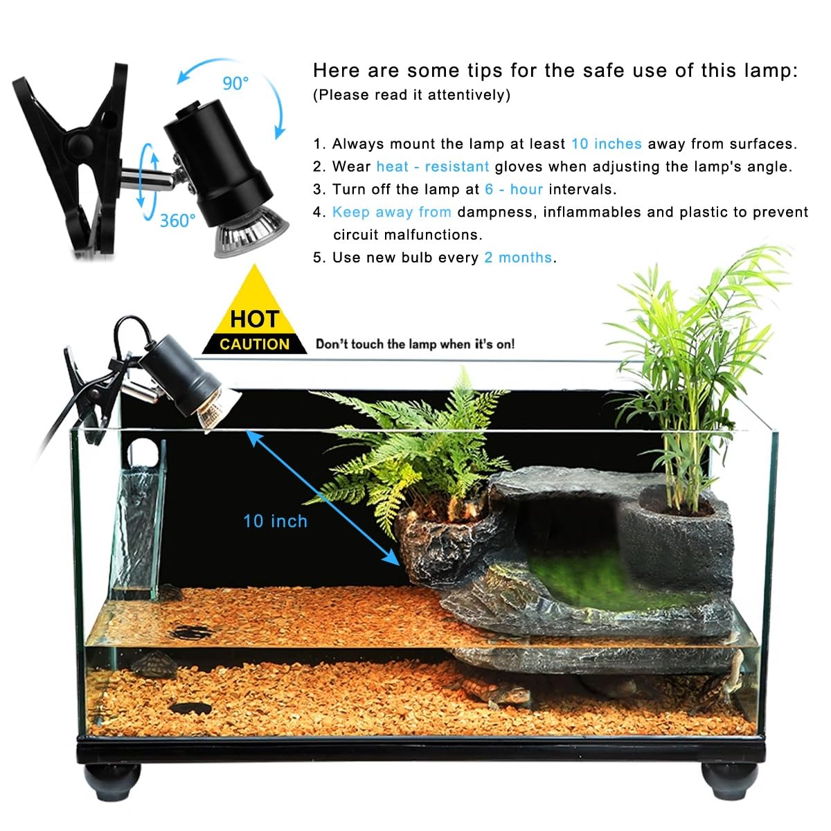 【Premium Material & Safety Design】Heating lamps feature heat-resistant aluminum alloy coating and reinforced ceramic base. CAUTION - Critical Safety Tips:1) Always mount the lamp at least 10 inches from surfaces ;2) Use heat-resistant gloves when adjusting angles;3) Shut off the lamp for 6-hour intervals; 4) Keep away from dampness, inflammables and plastic to prevent circuit malfunctions.