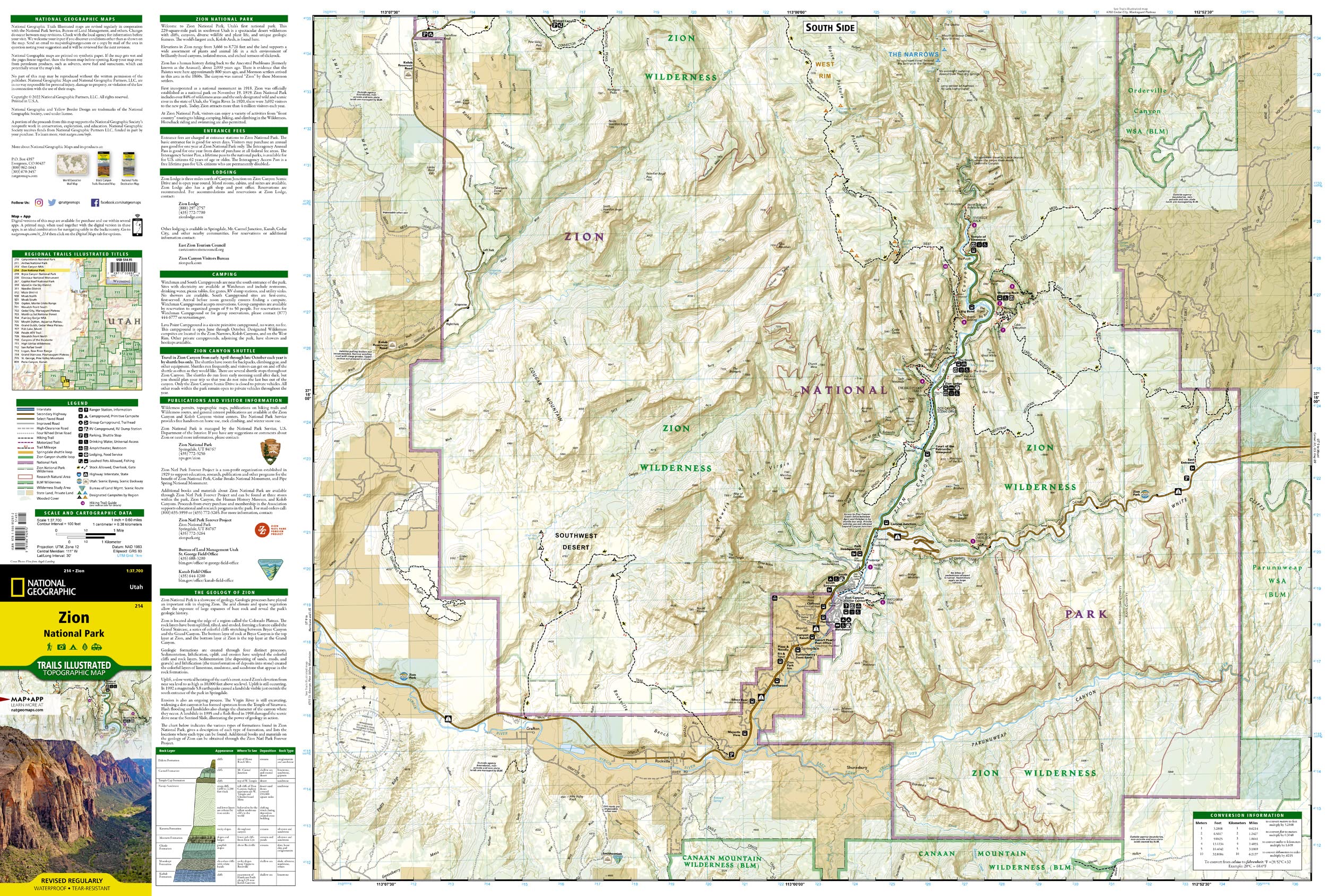 • Waterproof • Tear-Resistant • Topographic Map Explore the beauty and geological wonder of Utah's first national park with National Geographic's Trails Illustrated map of Zion National Park. Created in partnership with local land management agencies, this expertly researched map combines unmatched detail with useful information to help you get the most from your visit, including a chart detailing the extraordinary geology of Zion and a companion hiking timetable for the popular Zion Narrows. Key areas of interest featured on this map include: Zion Narrows, Kolob Canyons, La Verkin Creek Trail, Hop Valley Trail, Wildcat Canyon, West Rim Trail, Floor of the Valley Road, East Rim Trail, Telephone Canyon, and the Virgin River. With nearly ninety miles of mapped trails, trail summaries, and information about camping, lodging, and shuttles, the Zion National Park map will prove an invaluable tool on your journey. Trails are clearly marked and include mileages between intersections. The map base includes contour lines and elevations for summits, passes and major lakes. Some of the many recreation features include: campgrounds, trailheads, parking lots, designated campsites, and interpretive trails. Every Trails Illustrated map is printed on "Backcountry Tough" waterproof, tear-resistant paper. A full UTM grid is printed on the map to aid with GPS navigation. Other features found on this map include: Zion National Park. Map Scale = 1:37,700 Sheet Size = 37.75" x 25.5" Folded Size = 4.25" x 9.25"