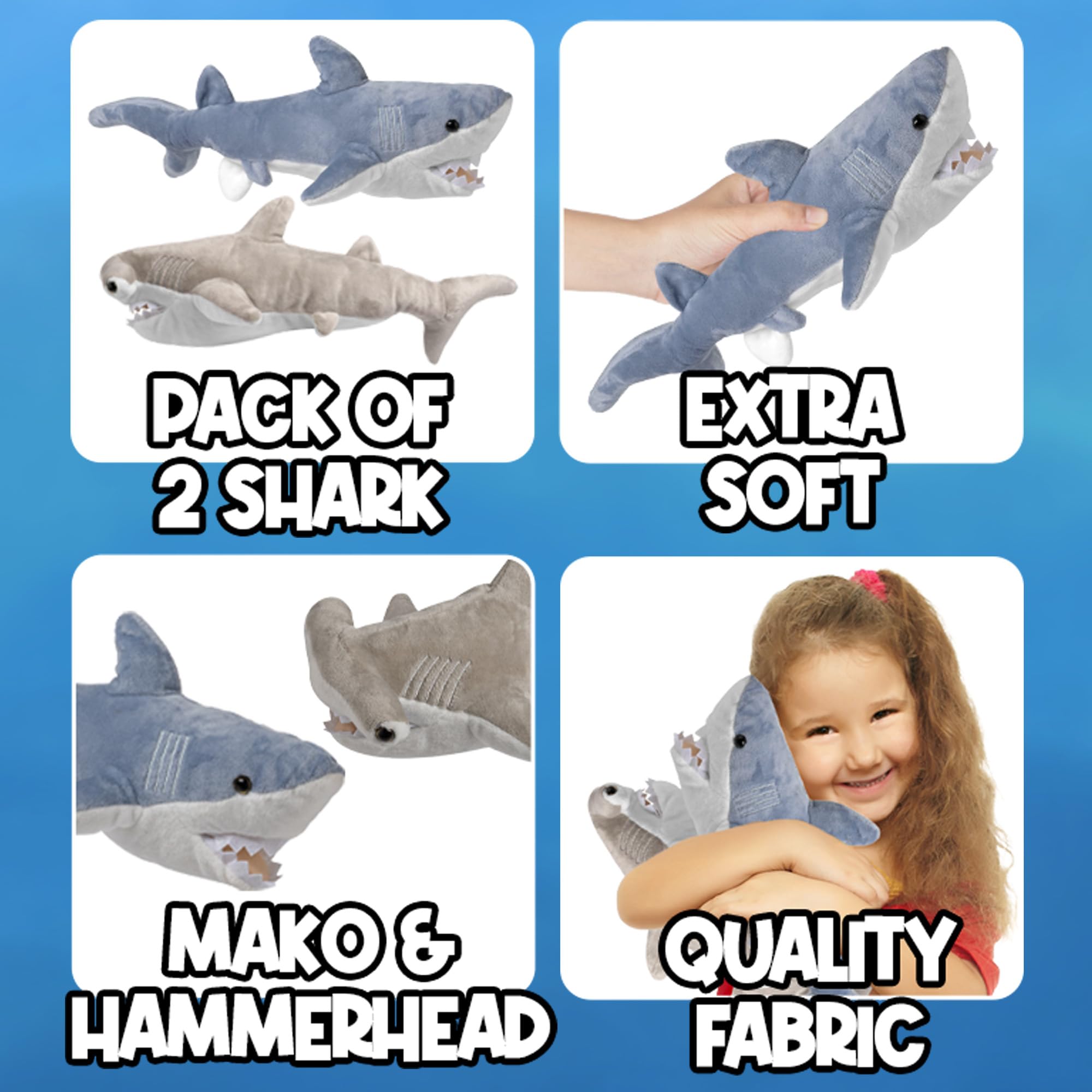 EACH SHARK COMES WITH ITS OWN STORY: Each shark has its own individual tag with fun facts about each animal. Are you looking for great quality stuffed animal shark toys then they will love these Mako & Hammerhead Shark Stuffed Animals.