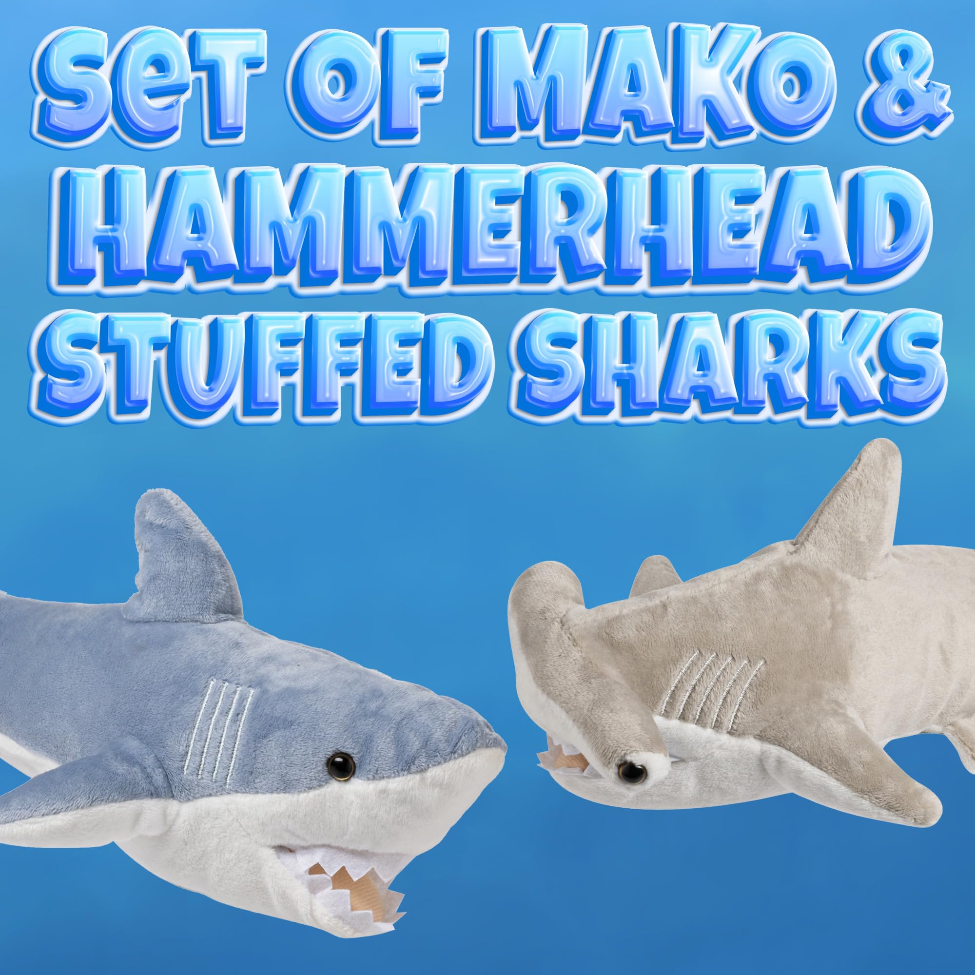 AWESOME! SET OF MAKO & HAMMERHEAD STUFFED SHARKS: Each set includes a Hammerhead shark that measures 13 inches and a Mako Shark that measures 14 inches in length. The Mako shark can be found in temperate and tropical seas all over the globe. Hammerhead Sharks are ferocious predators that hunt and tear apart their prey with their sharp teeth!