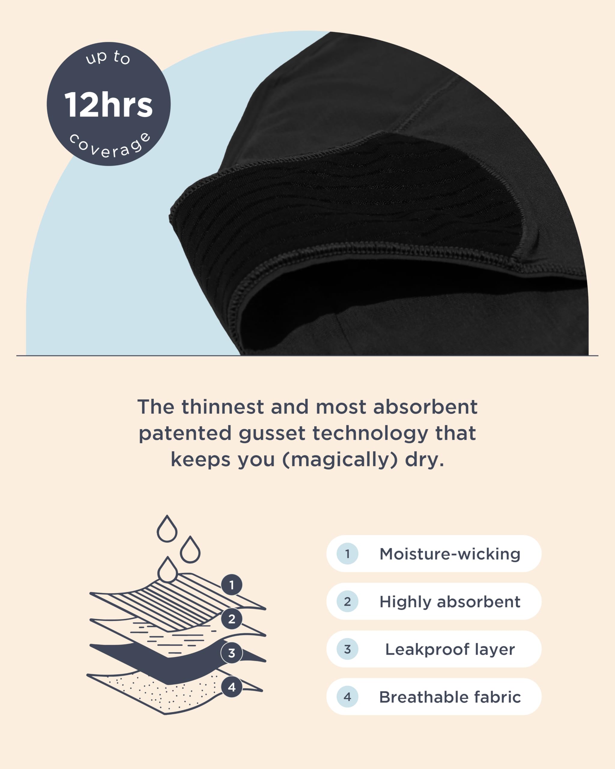LIGHTWEIGHT & DRY — Saalt Wear period underwear is thinner, drier, and more comfortable than any other period panties. Saalt Wear is made with patent-pending moisture-separating gusset technology that wicks away wetness and traps moisture beneath the first layer so you feel drier, longer.