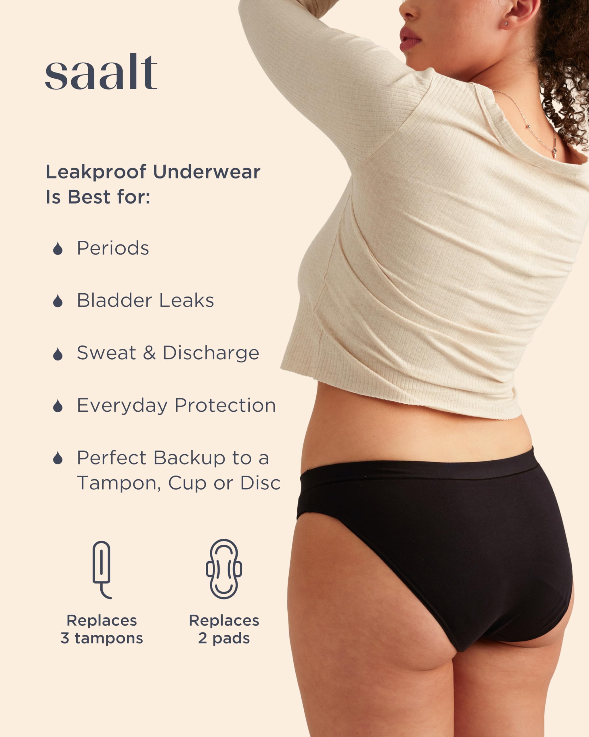 REUSABLE & CONVENIENT FOR ALL LEAKS — The easy, cheeky, customer favorite—now even softer. Made to withstand laughing with your best friend, the sweat of spin class, vivacious sneezes, and periods. Saalt leakproof underwear does it all, just like you. Just wear it, wash it, and wear it again.