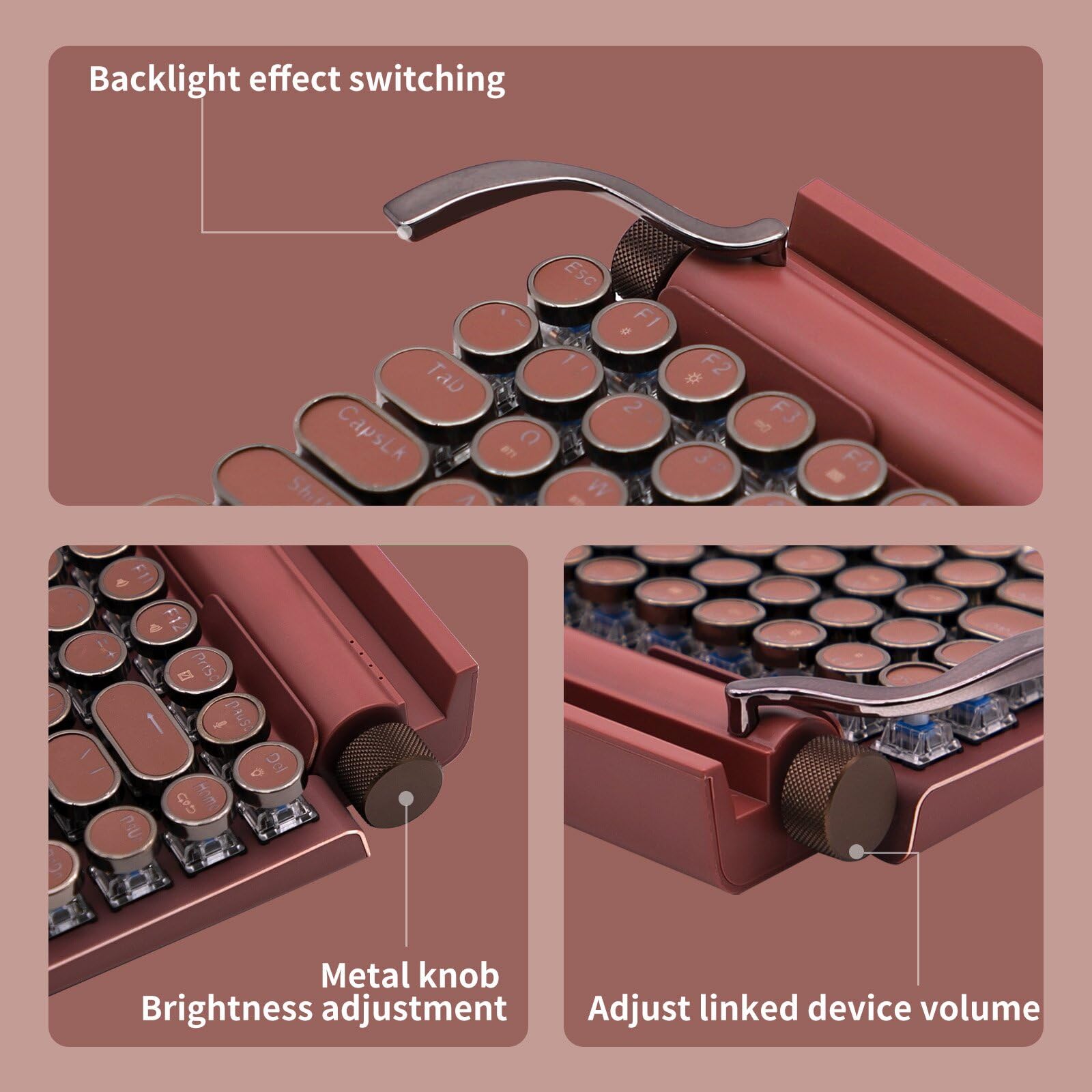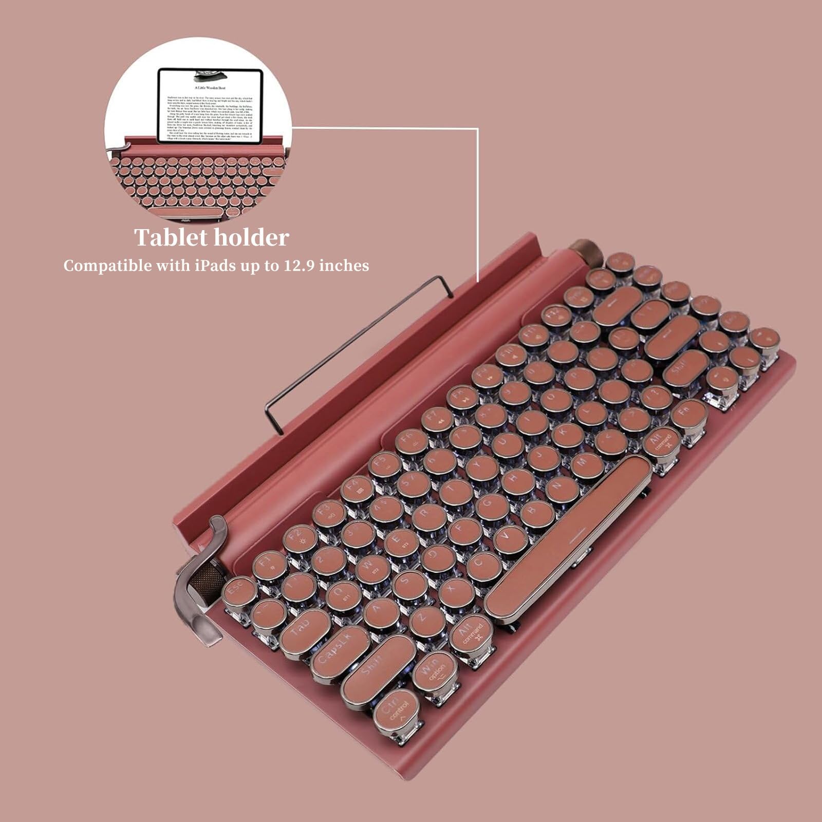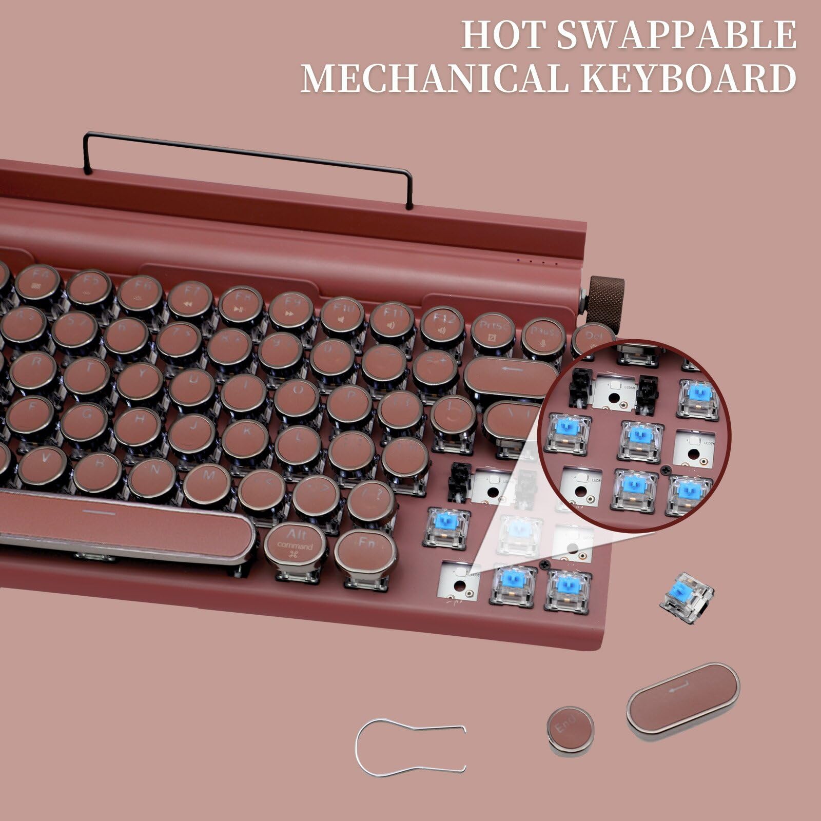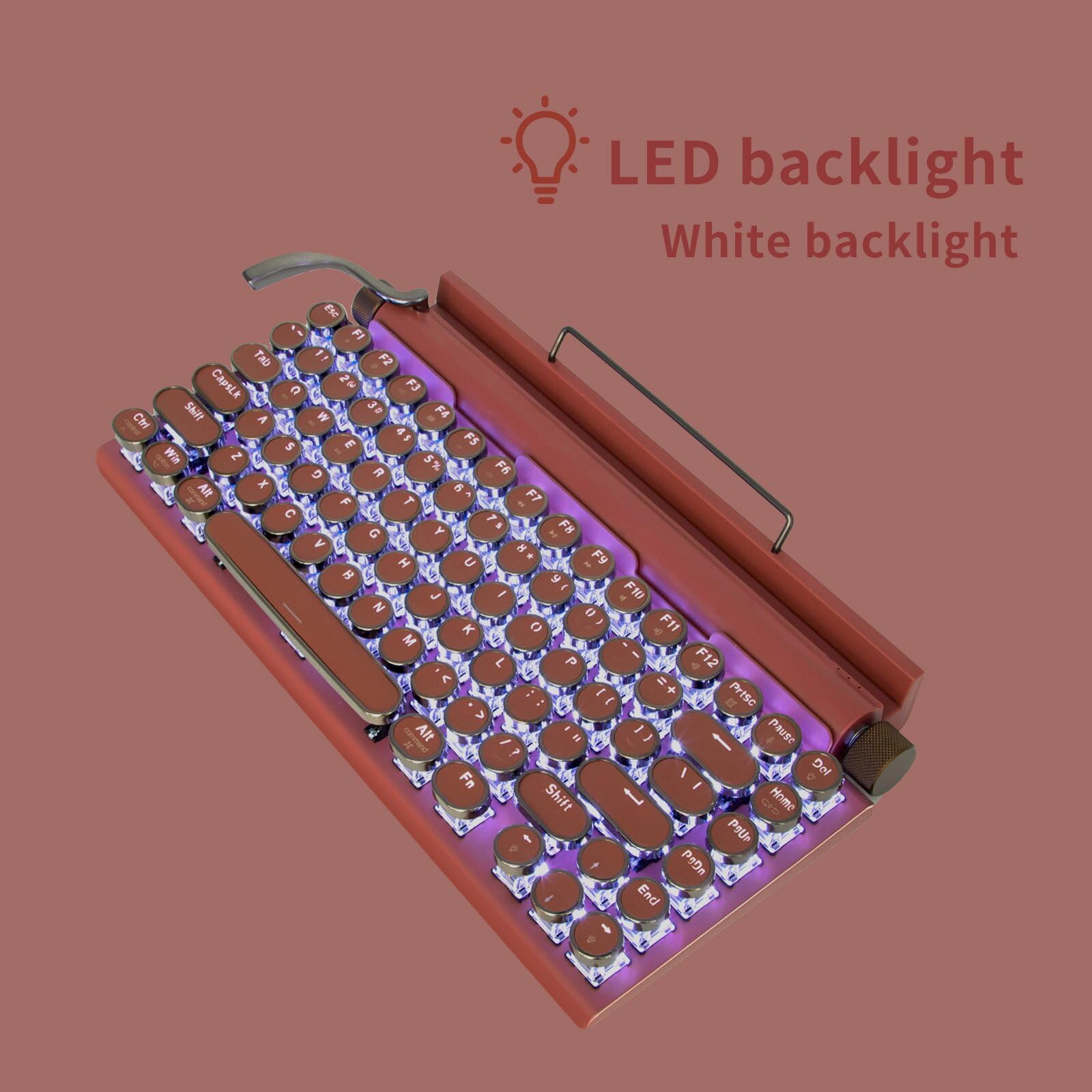 Featuring classic punk-inspired keycaps handcrafted from two assembled parts, this keyboard showcases a stylish mint green aluminum panel that adds a fresh, fashionable touch to the vintage typewriter design. With Bluetooth 5.0, it offers faster and more stable connections, supporting both wired and wireless modes, and allows easy switching between phones, tablets, and laptops. The hot-swappable blue mechanical switches provide a customizable, tactile typing experience. Delicate and charming, the mint green color is perfect for those who love stylish and compact accessories—making it an ideal gift for trendy and thoughtful users