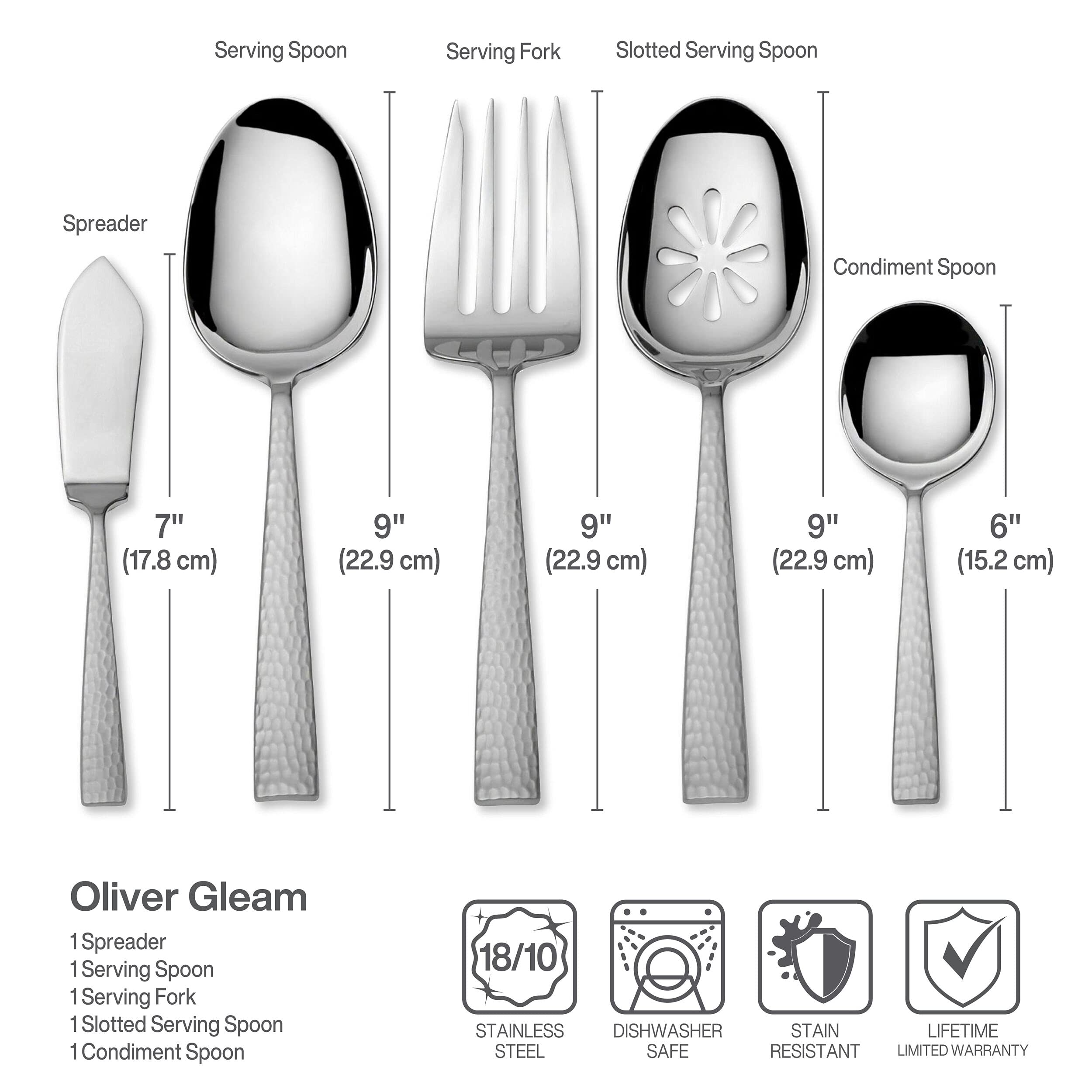 The classic design and casual tone of Mikasa Oliver Flatware is perfect for an elegant dinner or casual brunch. Each piece is crafted from premium 18/10 stainless steel to deliver outstanding beauty and performance. A modern hammered texture gives the sleek handles a faceted shimmer that will make a bold statement at every dining occasion. Flatware wears a lustrous mirror finish yet goes safely through the dishwasher without needing polishing. 65 piece set, service for twelve, includes (12) each: dinner fork, salad fork, dinner knife, dinner spoon, and teaspoon, plus (1) each: tablespoon, pierced tablespoon, cold meat fork, sugar spoon and butter knife. Dishwasher safe.