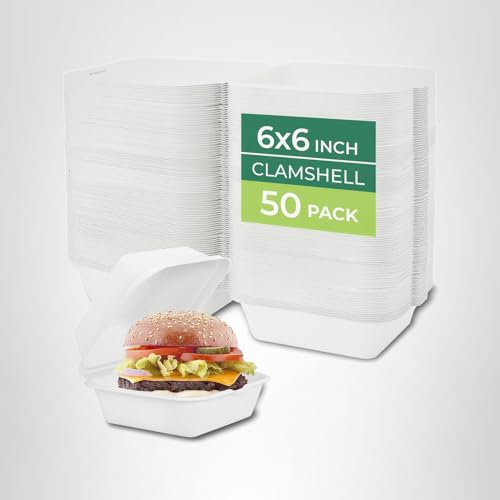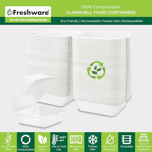 Introducing our Freshware 6 x 6 Inch Compostable Clamshell Take Out Food Container with Hinged Lid – an ideal choice for serving hot or cold food with convenience and sustainability in mind. Whether you're catering daily meals, running a restaurant, managing food trucks, handling to-go orders, or organizing special events, these disposable paper to go plates are designed to meet your diverse food service needs. Crafted from 100% BPI Certified Sugarcane Fiber, a sustainable, renewable, and biodegradable material, these to go paper food containers present a fantastic alternative to traditional paper or plastic options. Not only do they offer the same sturdy functionality and easy cleanup, but they also stand out as a zero tree and plastic-free choice. Our environmental commitment continues as these serving bowls are 100% compostable. Made from Sugarcane Fiber, they can be commercially composted, eliminating the need for landfill disposal. This ensures a quick degradation process, providing a convenient cleanup solution for you, your customers, and the planet. Our product adheres to the highest industry standards and is intended for composting in municipal or commercial facilities following best composting management practices. Versatile in use, these bowls are suitable for both hot and cold food items, providing reliable strength without any plastic or wax lining. They are also microwave and freezer-safe, as well as oil and cut-resistant, ensuring durability in various situations. Elevate any occasion with Freshware's Compostable Clamshells Food Storage Containers. With a diverse product range and a timeless design, Freshware guarantees premium, all-natural organic tableware for your family, friends, or any event. Whether you're planning a camping trip, picnic, lunch, catering event, BBQ, party, wedding, or managing a restaurant, these bowls offer the perfect blend of convenience and eco-friendliness.