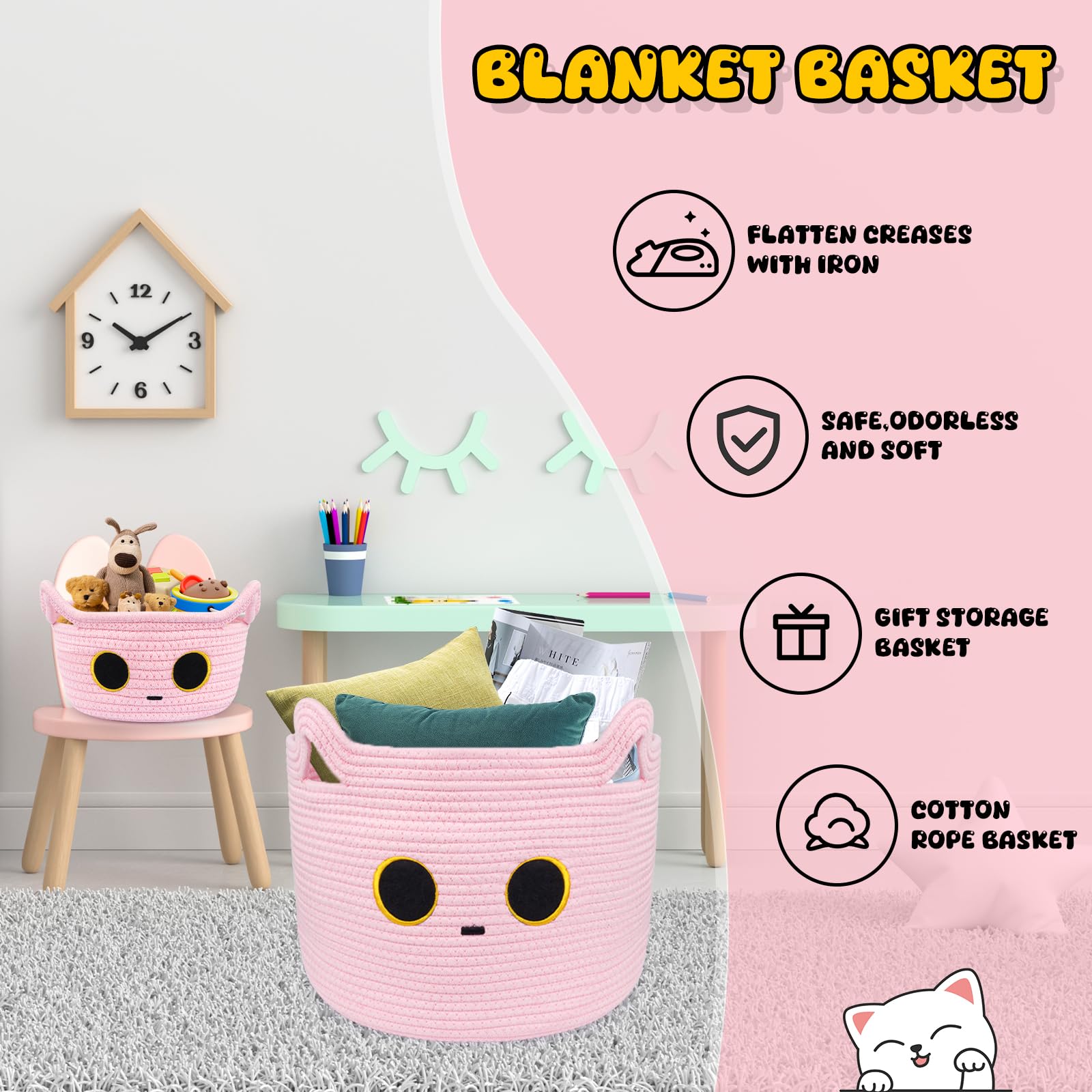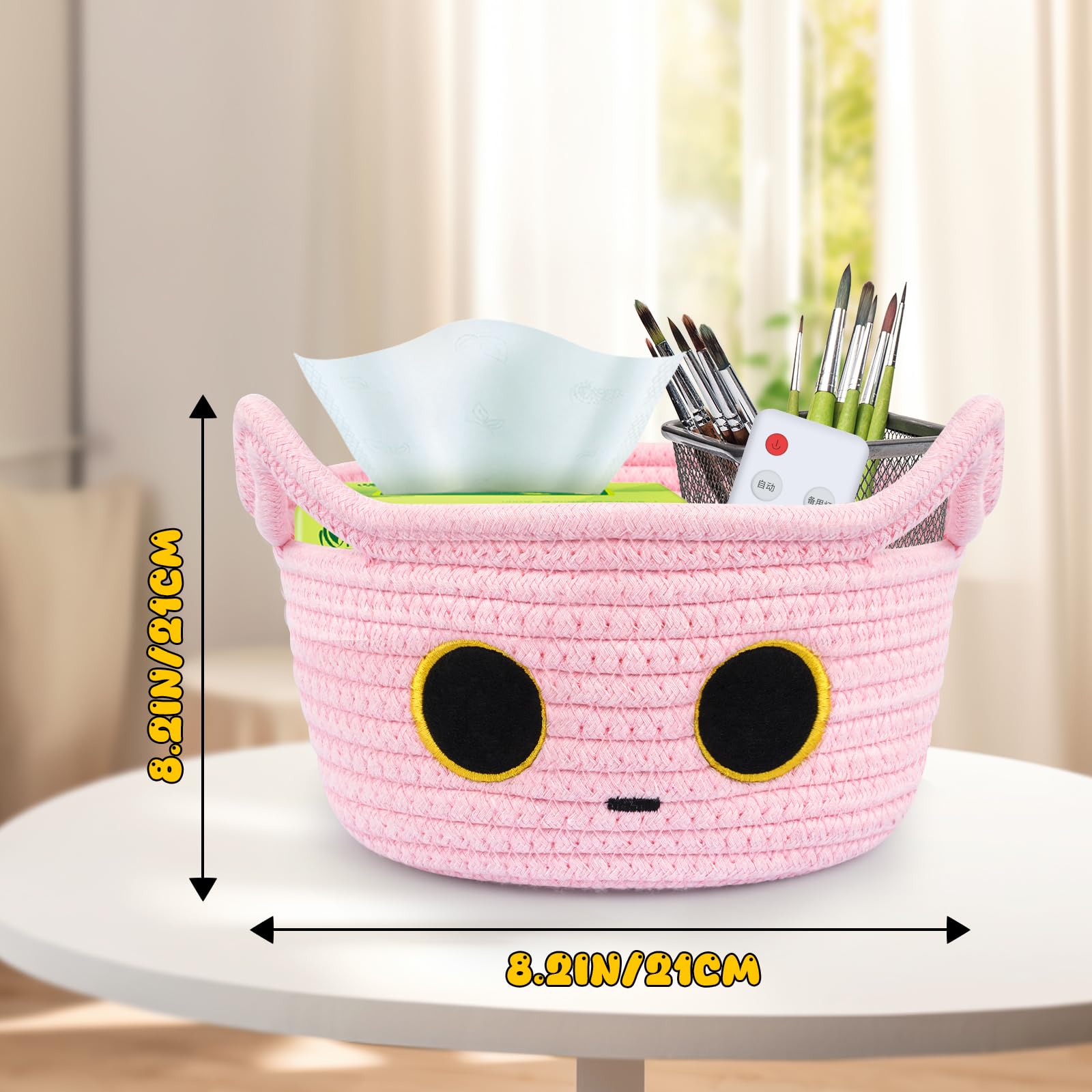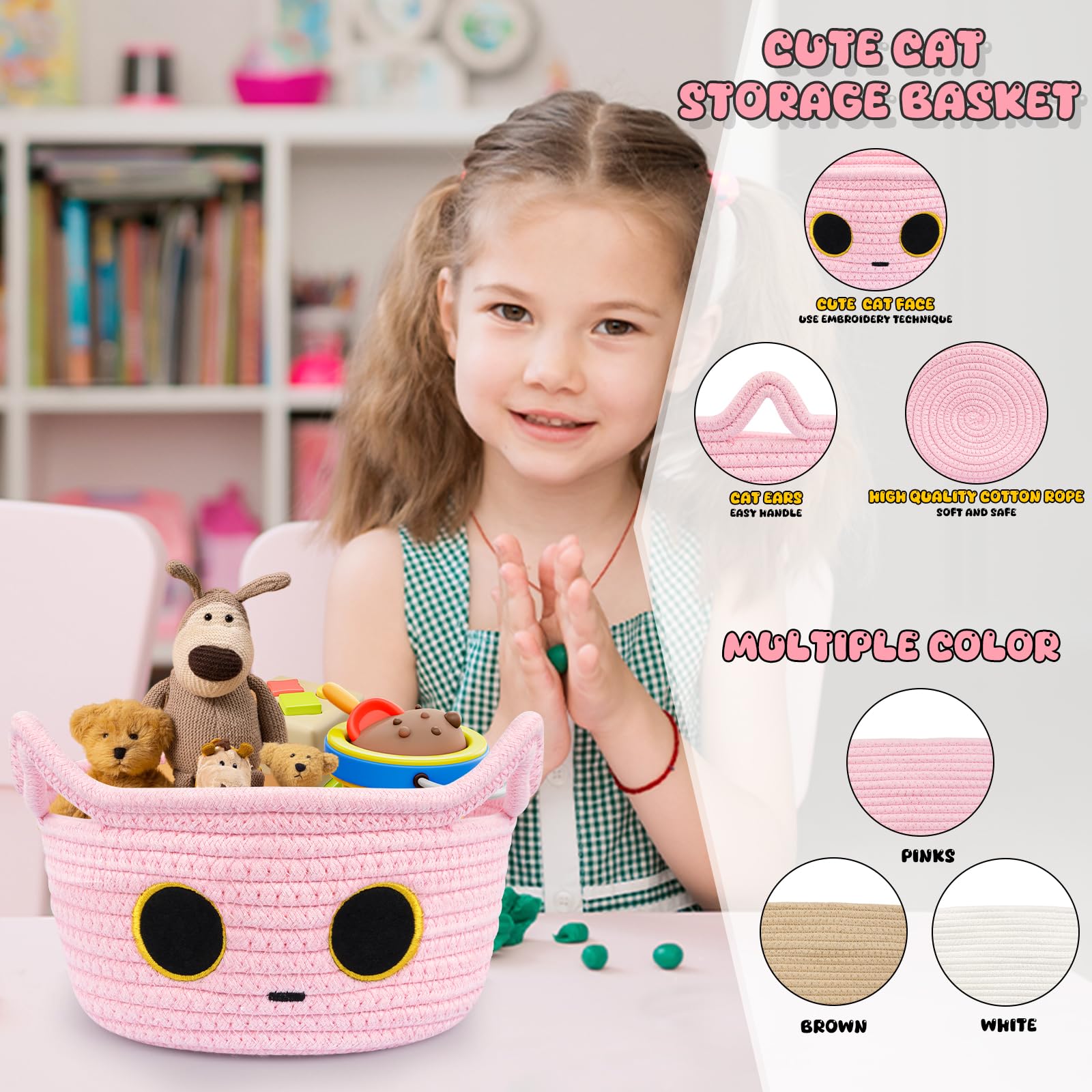 Cute Cotton Rope Basket Design: We've added a pinks cat to the original cotton thread woven in a single colourway,cat pattern use embroidery technique. This makes it practical and fun to decorate your space. The materials used are also non-allergenic so that you and your family can use it with peace of mind. The ears can with handles for easy carrying