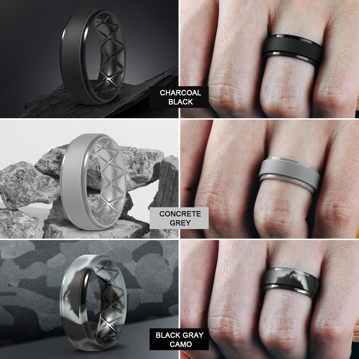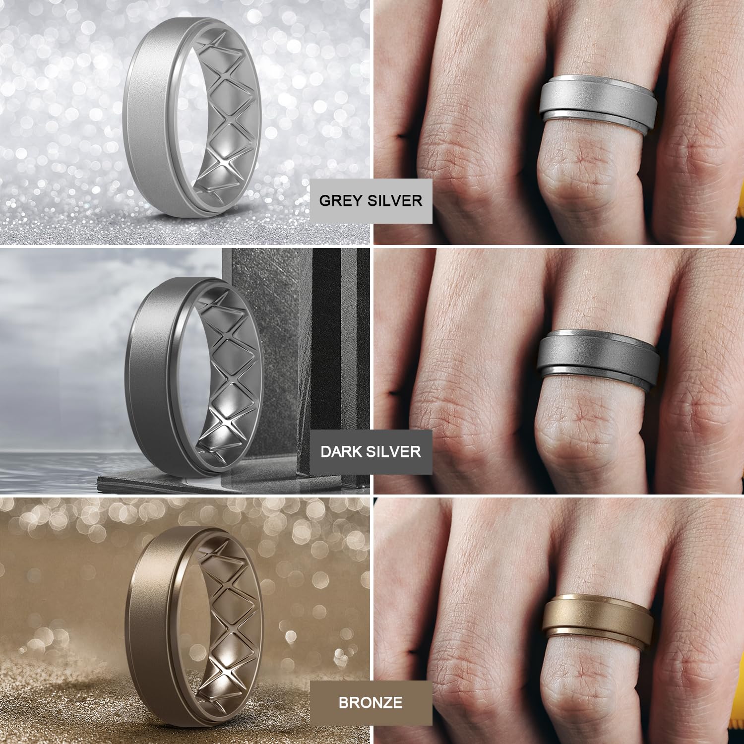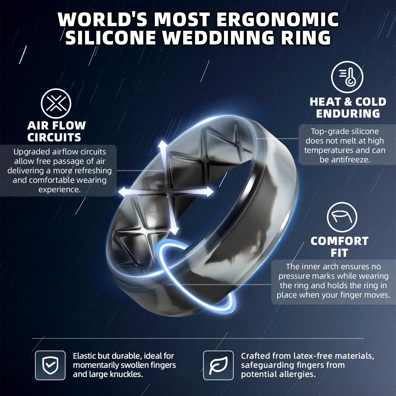 FLEXIBALE & SAFE: Top grade silicone is hypoallergenic, lightweight and soft. Superior than plastic rings in elasticity, skin adaptability and will break away while rubber wedding bands are under extreme stress to protect fingers. Easy to accommodate temporary swollen fingers or large knuckles and ideal for guys working with tools or electronics