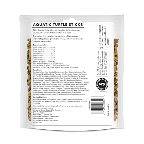 They’re nutritious, they’re delicious and they float perfectly in your turtle tank. Deep dive into your aquatic turtle’s nutritious dream diet with Zilla Turtle Sticks. Crafted to deliver optimal nutrition, these sticks are packed with essential proteins, vitamins, a prebiotic and probiotics to help your turtle be at their best. These floating pellets are free from artificial colors and preservatives, containing only natural ingredients with added vitamins and minerals. The comprehensive and nutrient-rich formula supports your turtle’s well-being and is made to promote robust growth and vitality. Black soldier fly larvae and shrimp meal provide optimal protein while the prebiotic and probiotics promote healthy digestion. Better yet, adding Zilla Turtle Sticks to water helps reduce odors in your turtle tank and maintains overall water clarity. The sticks float and expand in water without falling apart for a clean and enjoyable eating experience that will make even the most timid turtle come out of their shell. These are perfect for a thriving aquatic environment and are also suitable for salamanders and newts. They are intended as a primary food source but can also be fed as a treat for your turtle in small doses. Bring out the best in your turtle with the optimal nutrition provided by Zilla Turtle Sticks. Celebrate your pet and Rep Yourself, with Zilla.