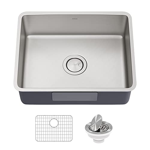 OUTER SINK DIMENSIONS: 21 1/4 in. L x 17 3/8 in. W x 7 3/4 in. D; INNER DIMENSIONS: 19 3/4 in. L x 15 3/4 in. W x 7 1/2 in. D; Minimum Cabinet Size: 24 in. – SINK KIT INCLUDES: Large single bowl undermount sink, protective bottom grid with soft rubber bumpers, VersiDrain assembly with removable strainer and FlipCap