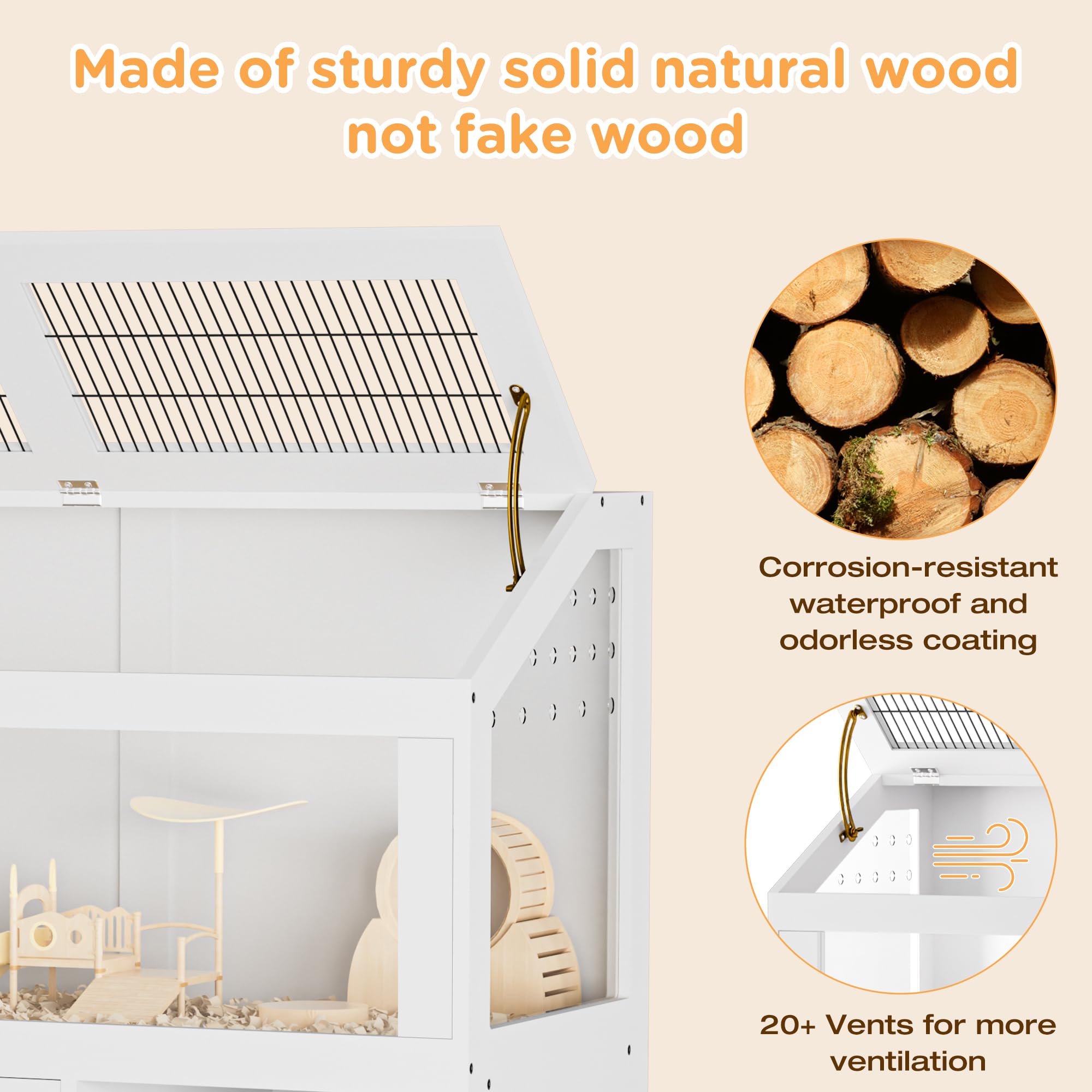 Hamster Cage Details: Transparent acrylic panels allow you to observe your hamster's activities from all angles, while breathable ventilation on the top and sides ensures a constant flow of fresh air. The top panel can be opened for easy feeding and interaction, and the PVC base is leakproof