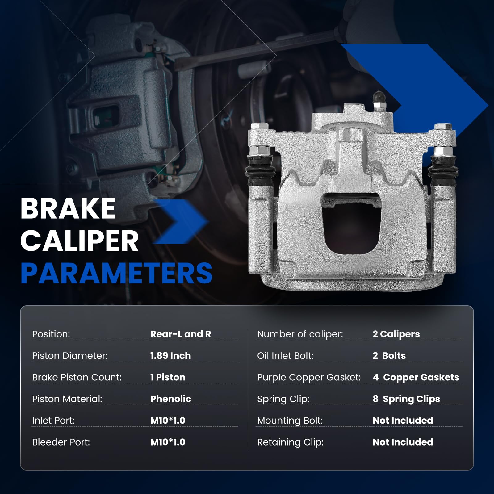 [Package Includes] - ①1*Rear caliper 18B5047 + 1*Rear caliper 18B5046 ②Oil Inlet Bolt: 2 ③Purple Copper Gasket: 4 ④Spring Clip: 8