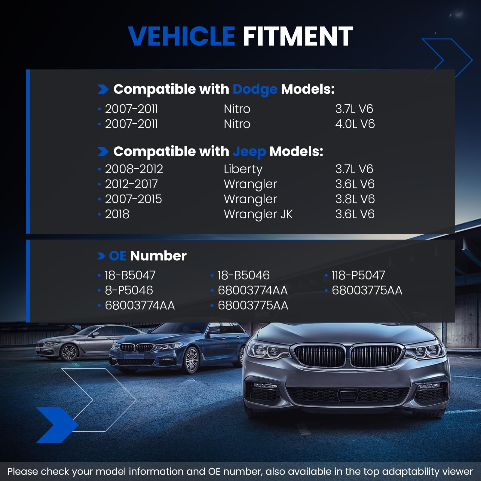 [ Vehicle Fitment ] - Compatible with Dodge Nitro 2007-2011 3.7L V6, 2007-2011 4.0L V6. Compatible with Jeep Liberty 2008-2012 3.7L V6. Compatible with Jeep Wrangler 2012-2017 3.6L V6, 2007-2015 3.8L V6. Compatible with Jeep Wrangler JK 2018 3.6L V6.