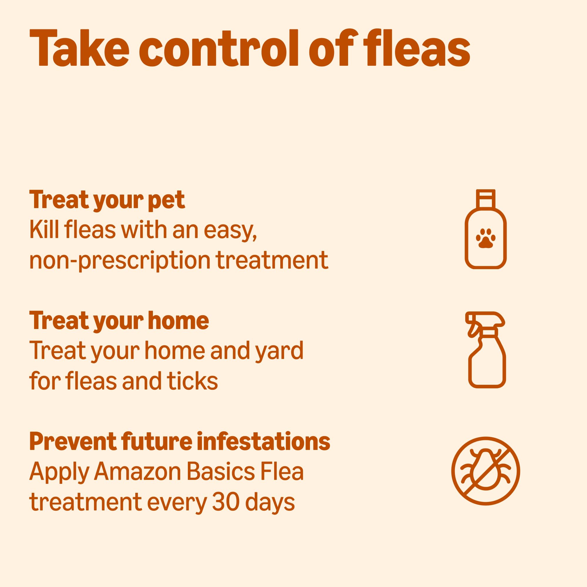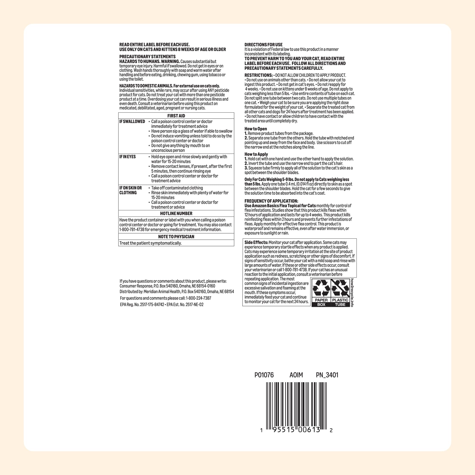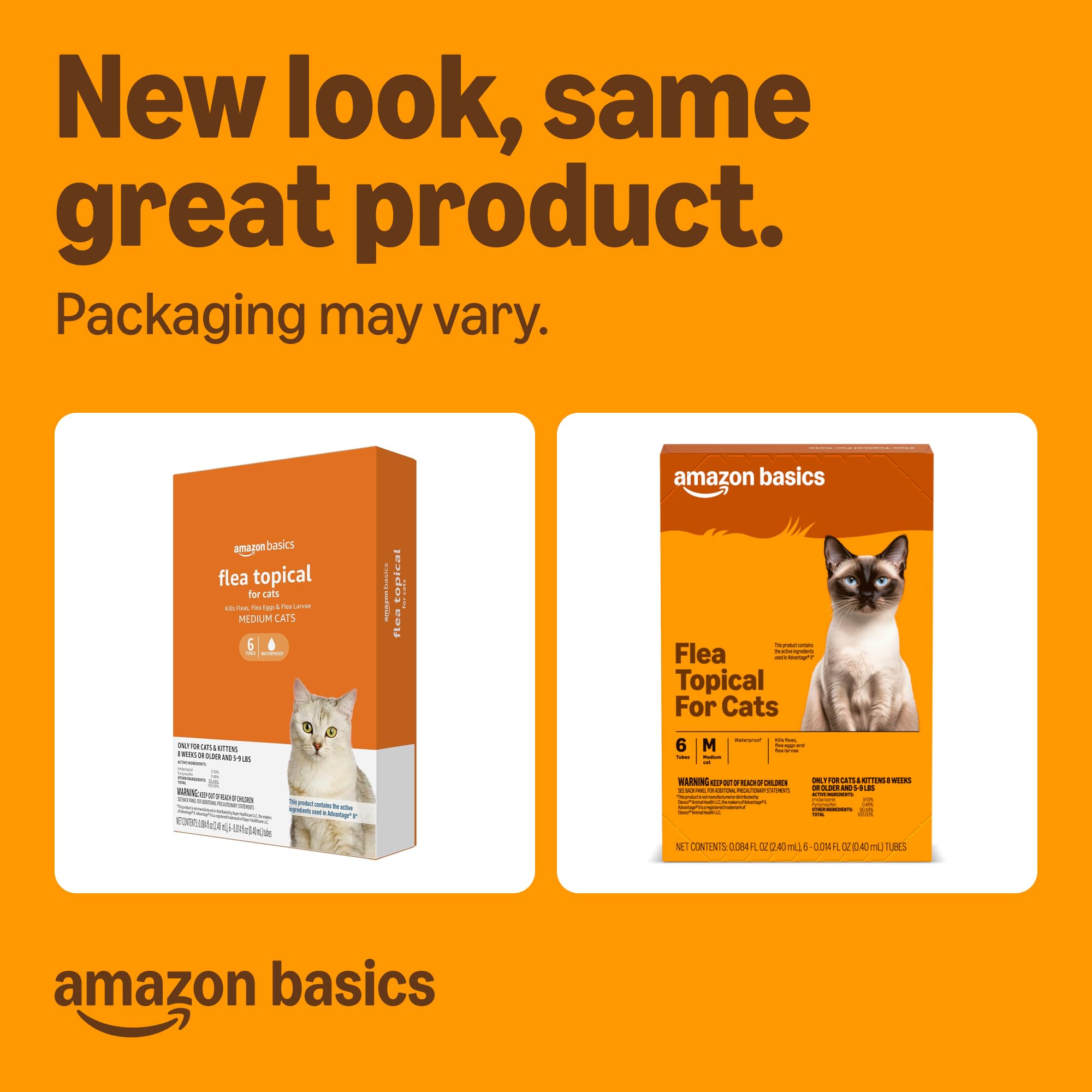 Product Description Amazon Basics Topical Flea Treatment for Medium Cats (5-9 pounds) prevents and kills fleas. This cat flea topical treatment provides the same effective formulation in a 6-dose pack. Our topical flea treatment for cats begins eliminating fleas as soon as 12 hours of application, including eggs and larvae. Active ingredients Imidacloprid and Pyriproxyfen work together to prevent flea infestations. For best results, apply these cat flea drops directly to the dry skin on the back of your cat, between the shoulder blades on a monthly basis. This flea treatment kills and prevents fleas for up to 30 days after application. Quality products for happy pets. From the Manufacturer Amazon Basics