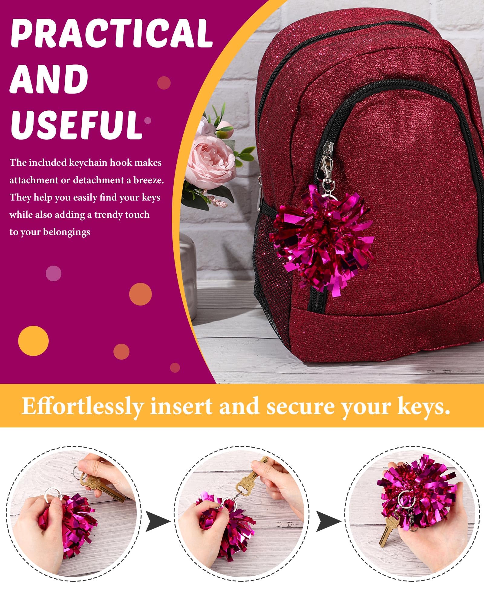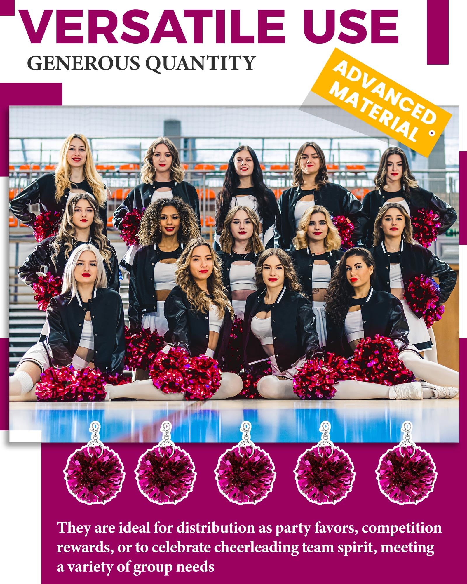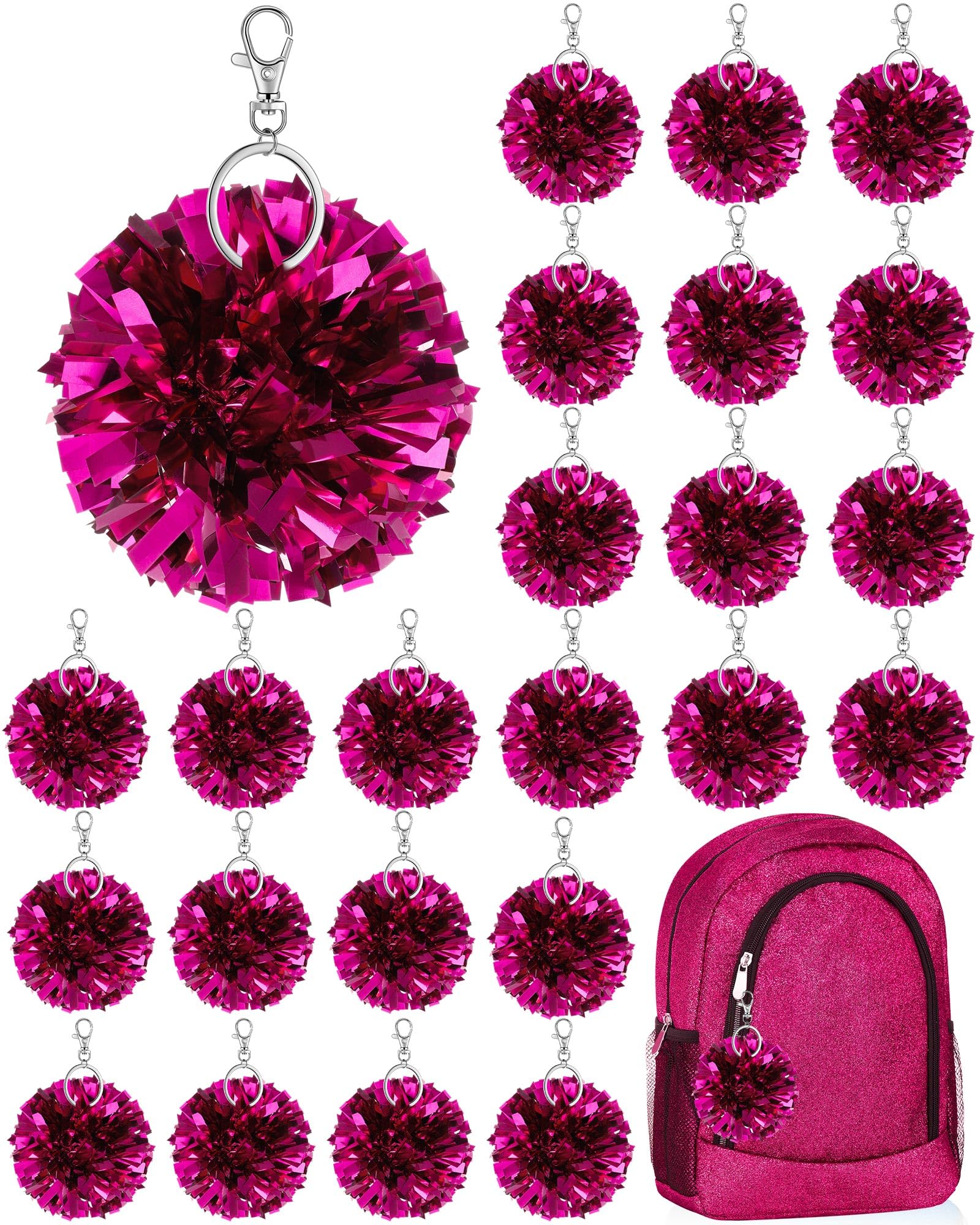 Sturdy Material and Vibrant Colors: these pom pom keychains are made of quality plastic and metal for quality, and feature non fading, shimmering metallic rose red foil; They catch the eye, boost cheerleading spirit, and show your strong support for the team