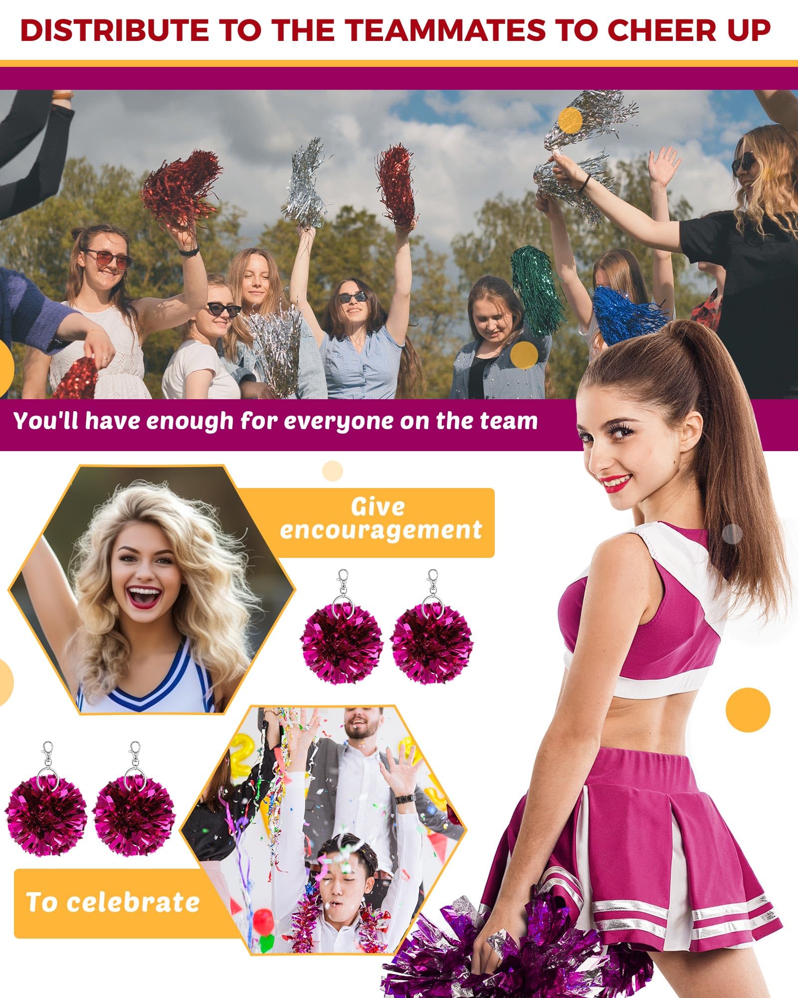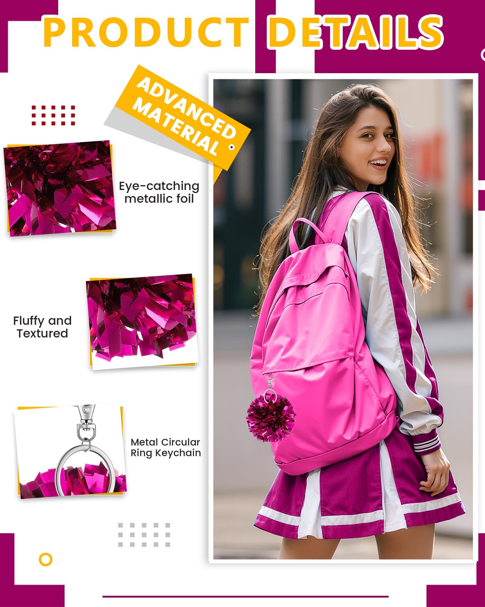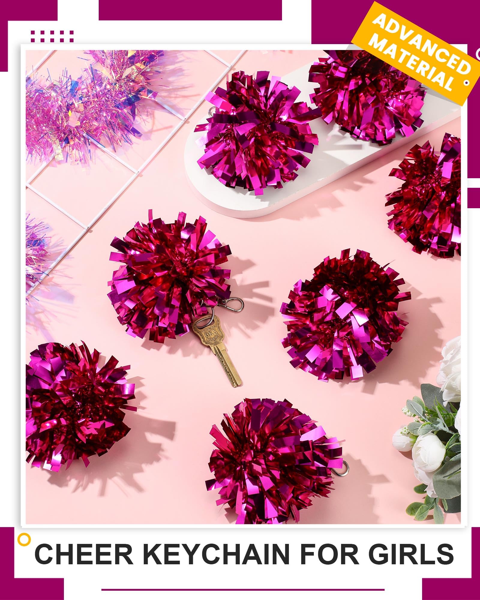Sturdy Material and Vibrant Colors: these pom pom keychains are made of quality plastic and metal for quality, and feature non fading, shimmering metallic rose red foil; They catch the eye, boost cheerleading spirit, and show your strong support for the team