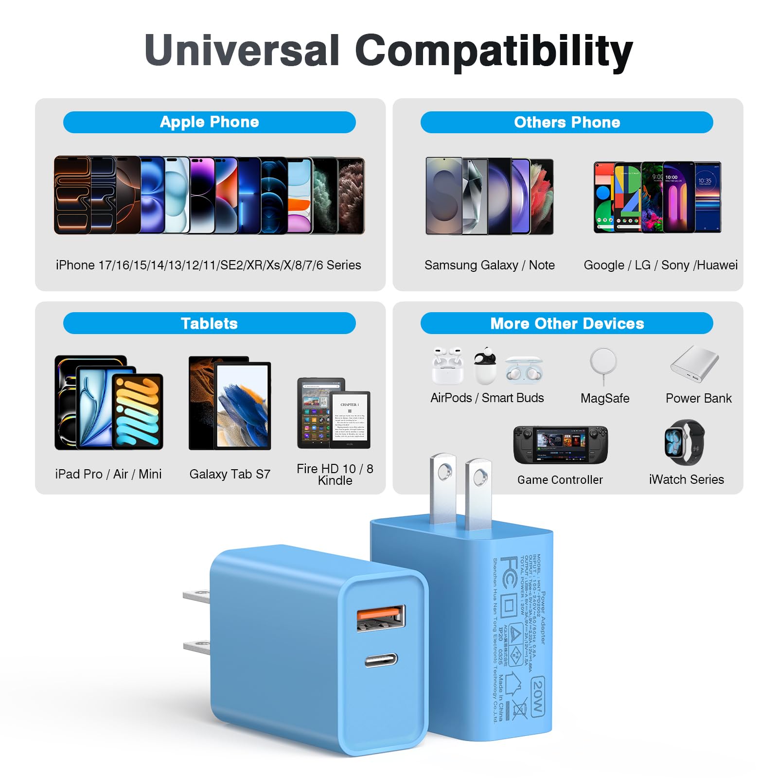 Universal Compatation: Designed for iPhone 17/16/15/14/13/12/11 Pro/Pro Max/Plus/iPhone 8 and later. The USB charging adapter is compatible for iPhone, iPad, iPod, smartphone, MP3 / MP4 players, play equipment, GPS devices, PC tablet, Google Nexus Tablet, Samsung Galaxy Tab and other digital devices compatible
