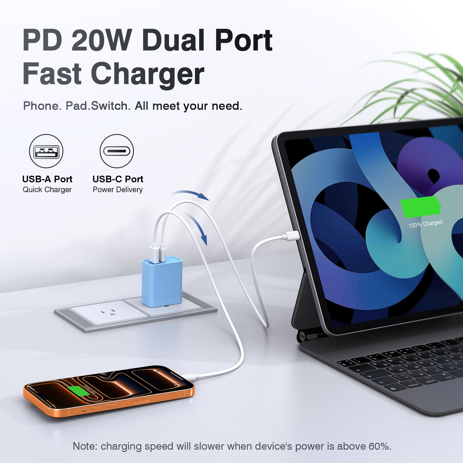 High-Speed Charging: The USB-C port supports a maximum power output of 20W. Dual-port design with USB-C and USB-A,charge two devices at the same time to minimize waiting time and frees you from messy chargers with various interfaces