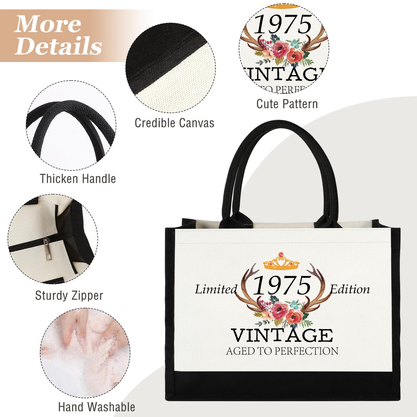 1975 Birthday Gifts for Women: Combining practicality and fashion, the 50th birthday tote bags are not only cute but also add stylish touch to any outfit, making them a great accessory for any occasion. In addition to the roomy main compartment, our tote bags feature a premium metal zipper top closure, which enhances both privacy and security, preventing items from accidentally falling out