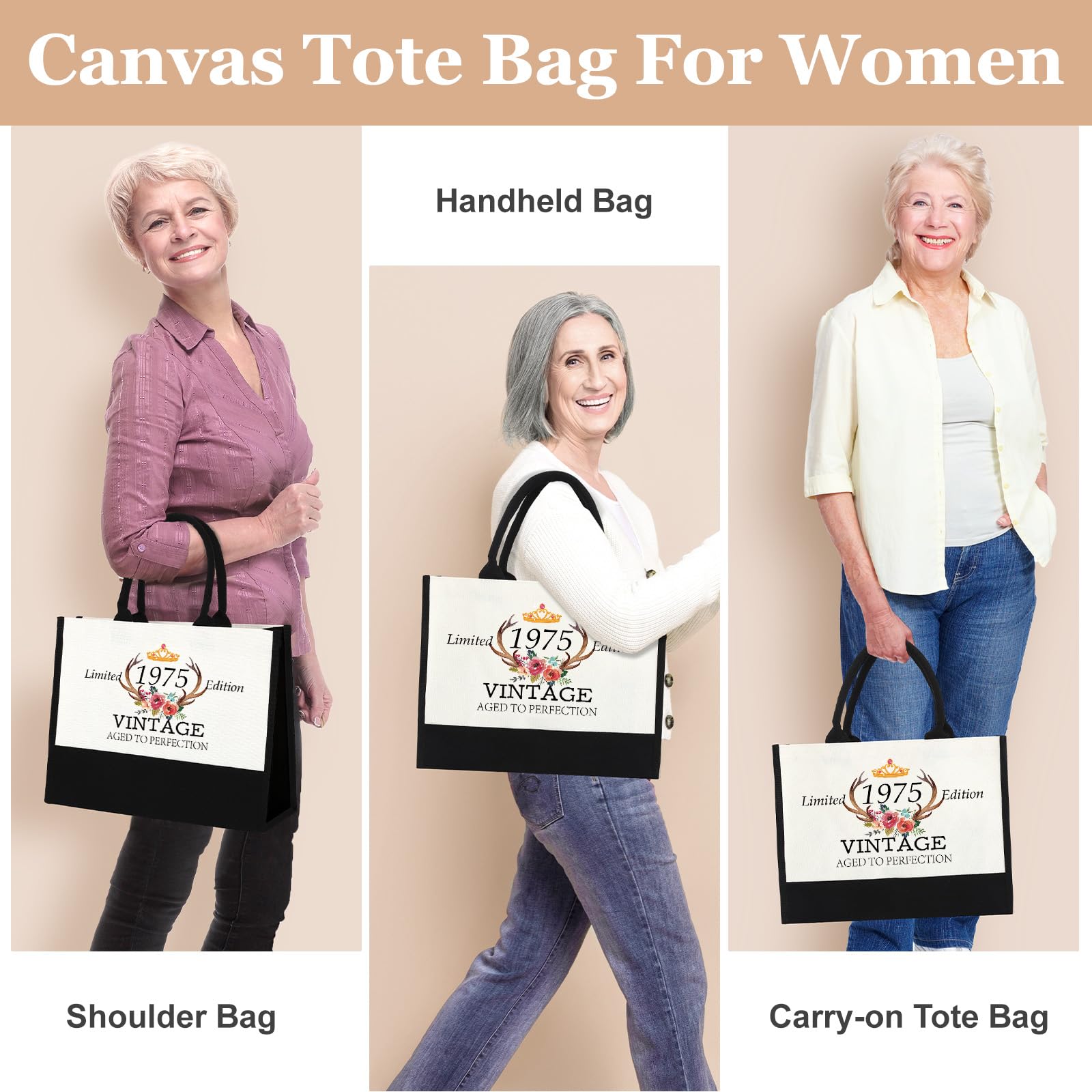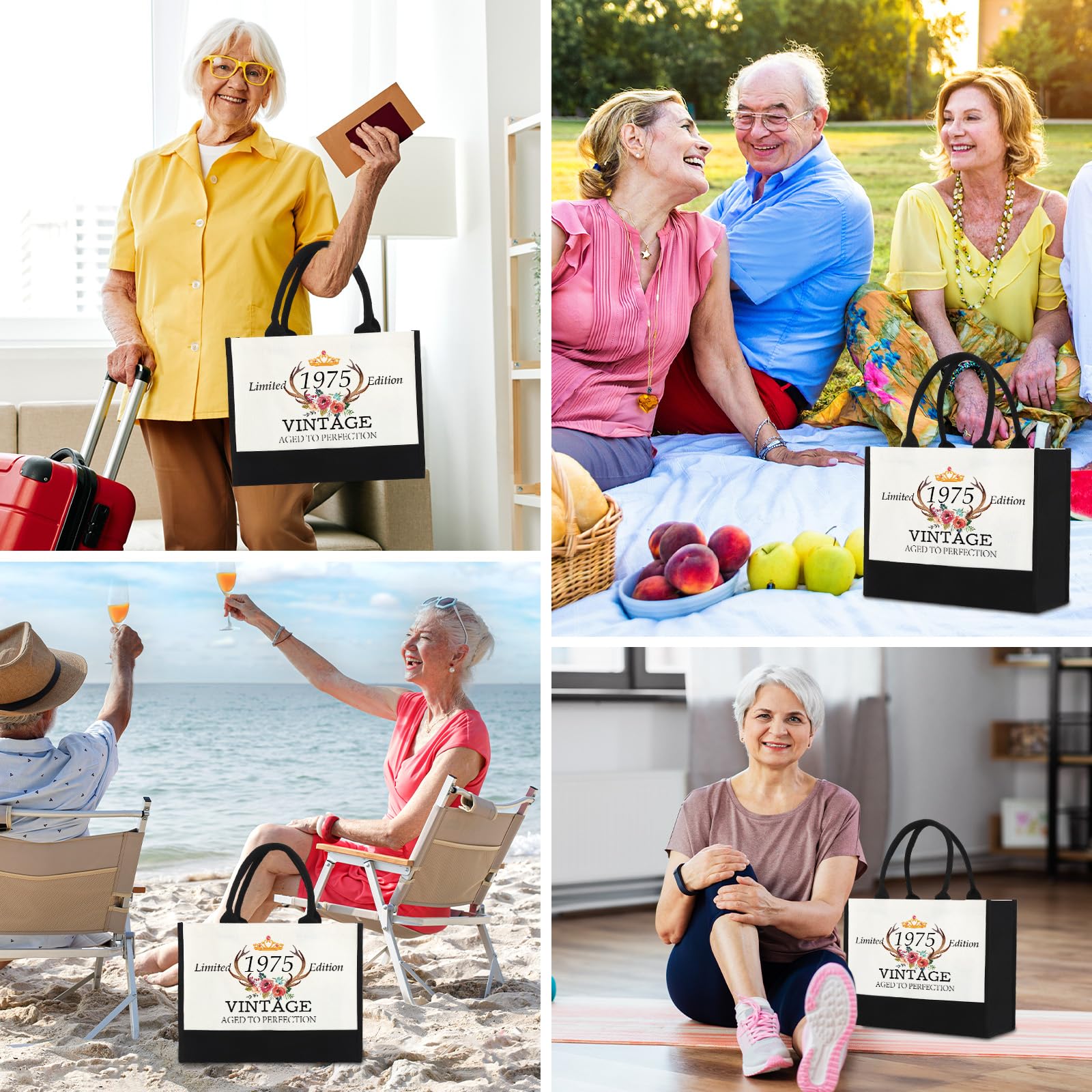 Large Capacity 1975 Tote Bag: This canvas tote bag for 50th women is 12.8" L x 5.3" W x 11"H, which is designed to be the ideal size for carrying items without appearing too large or small, roomy enough to hold your daily accessories like iPad, books, phones, cosmetics, clothes, water bottles, etc. Made of high-quality cotton canvas material, Our beach bag can withstand daily wear and tear, all seams are closed with tight thread, ensuring their durability