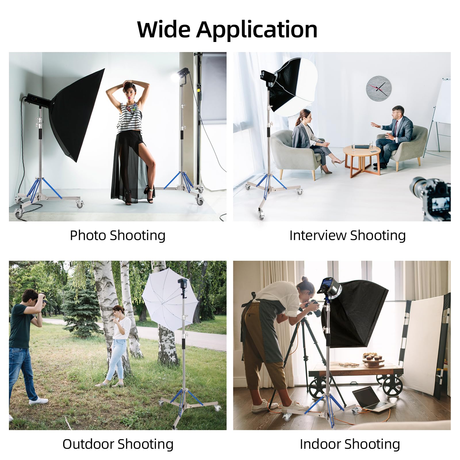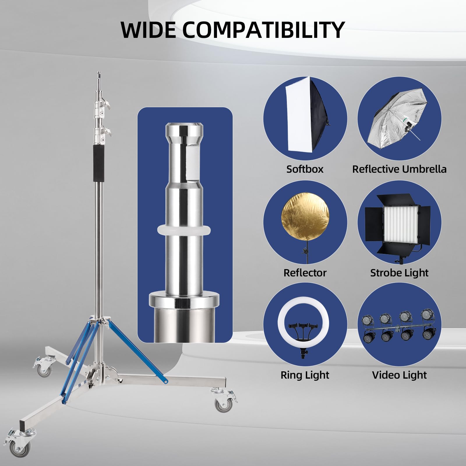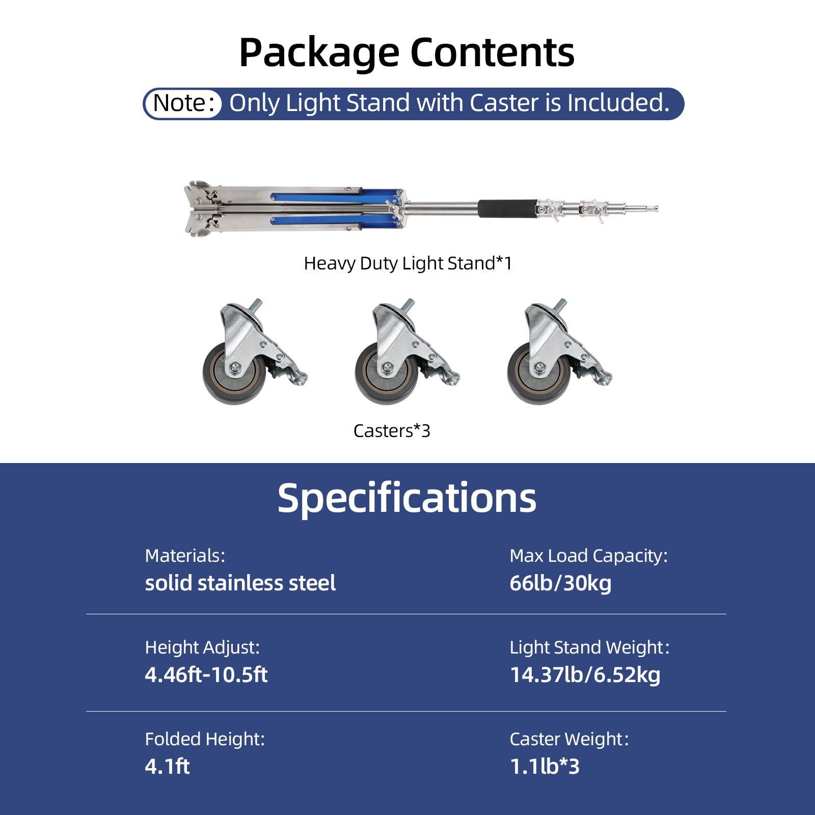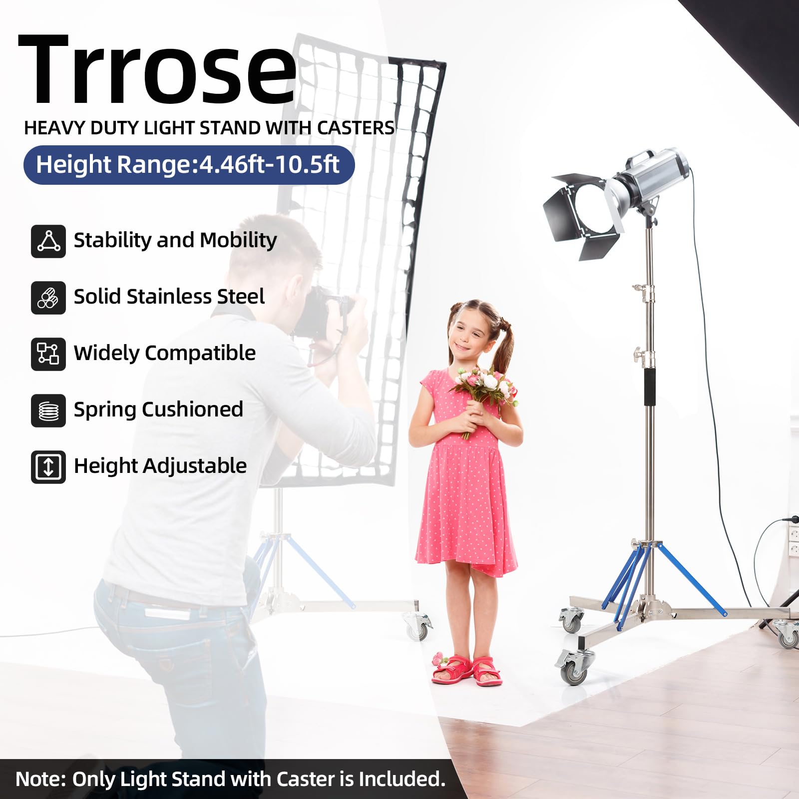 [Light Stand with Caster Kit]:Light stand kit includes 1 × heavy duty light stand; 3 × 360° swivel casters. Trrose light stand with caster supports a variety of applicable products, such as reflectors, monolights, umbrellas, flashes, softboxes, cameras.