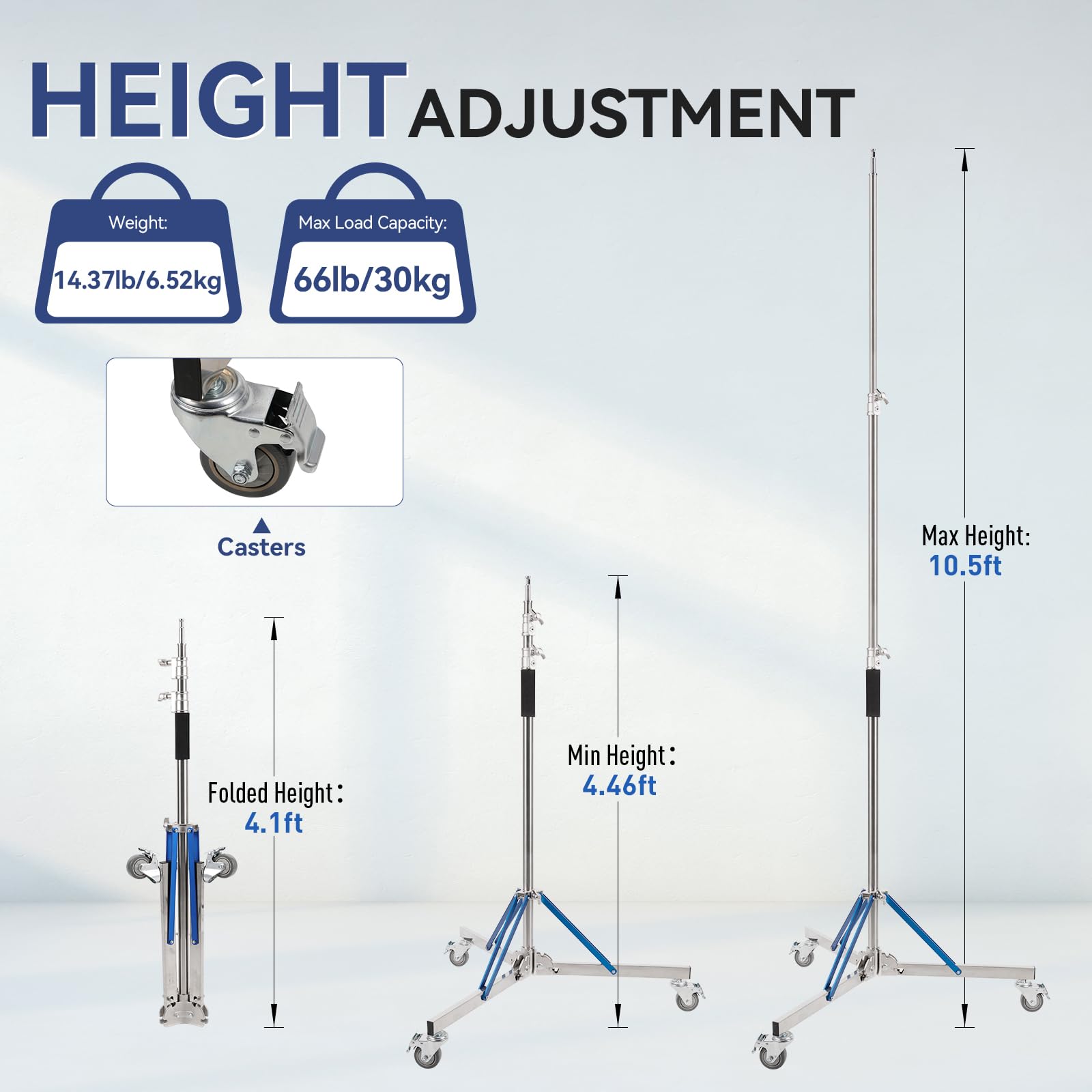 [Adjustable Height Tripod Stand]: Photography light stand with caster can meet shooting and lighting needs of different heights, heavy duty light stands supports from the min height 4.46ft to the max height 10.5ft. Trrose light stand folded height 4.1ft, allowing you to invert the tripod light stand photography lay it flat anywhere for efficient transportation and easy portability, heavy duty light stand comes with sponge pads for a stable hand grip when you push the light stand.