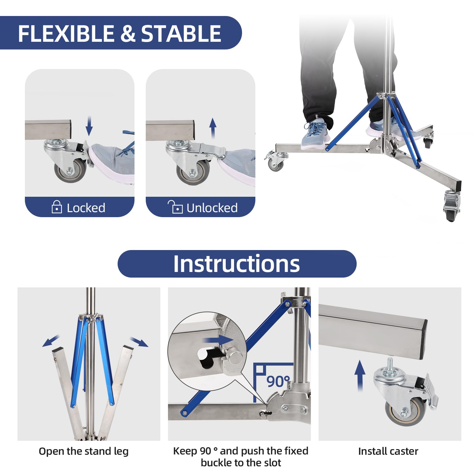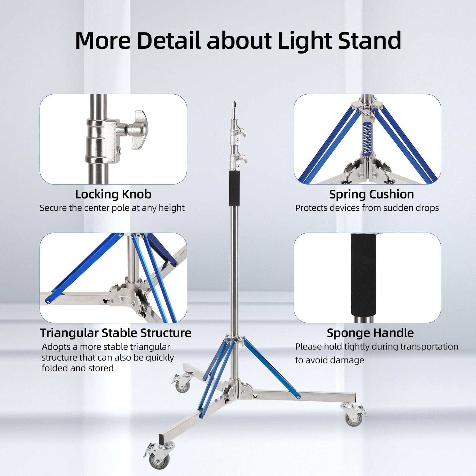 [High Mobility Tripod Stand with Caster]: To make it easier to move the heavy-duty light stand, we also have 360° swivel casters that allow you to easily move heavy equipment both indoors and outdoors, avoiding dragging and lifting, and the rubber wheels protect the floor from scratches. Trrose light stand with casters use a tread brake to lock and open casters, and locking the casters keeps the light stand stationary and prevents light stand photography from moving.