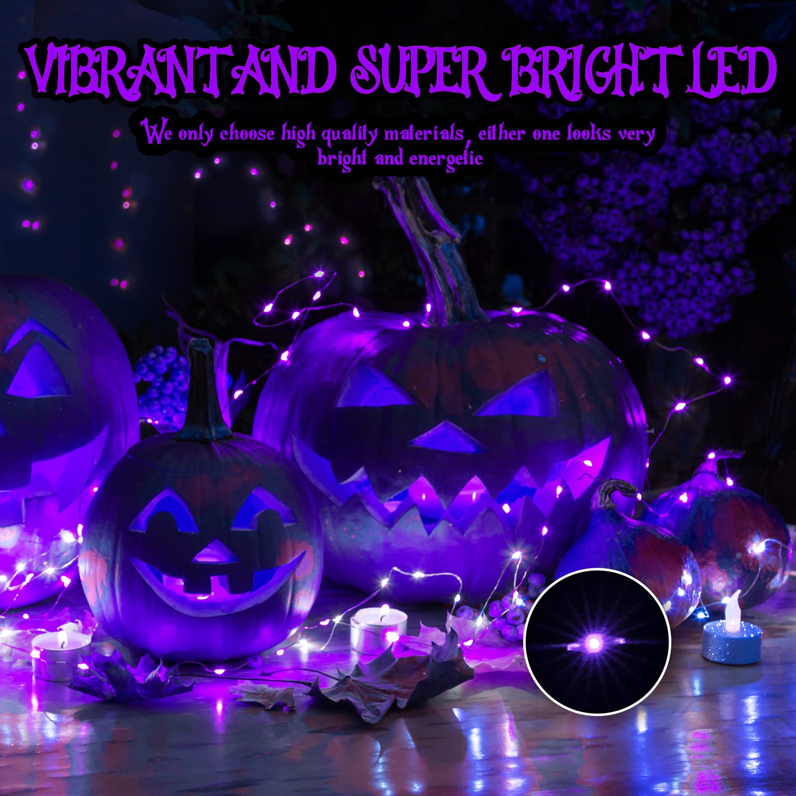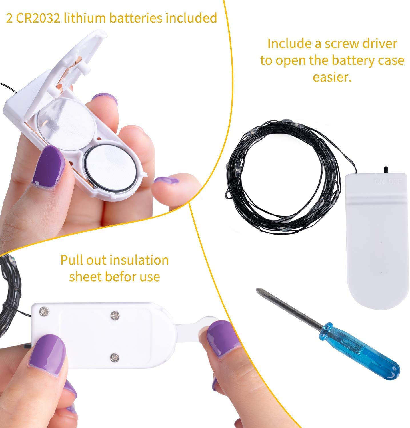 【 Purple Halloween Fairy Lights】- 24 pack 20 LED fairy lights are made of high quality 7 feet long flexible silver wire. Use 0.66 feet cable between the the first LED and battery box, 4 inch distance between led String lights. 2 x CR2032 batteries per lights and a screwdriver included, 72 hours of battery life