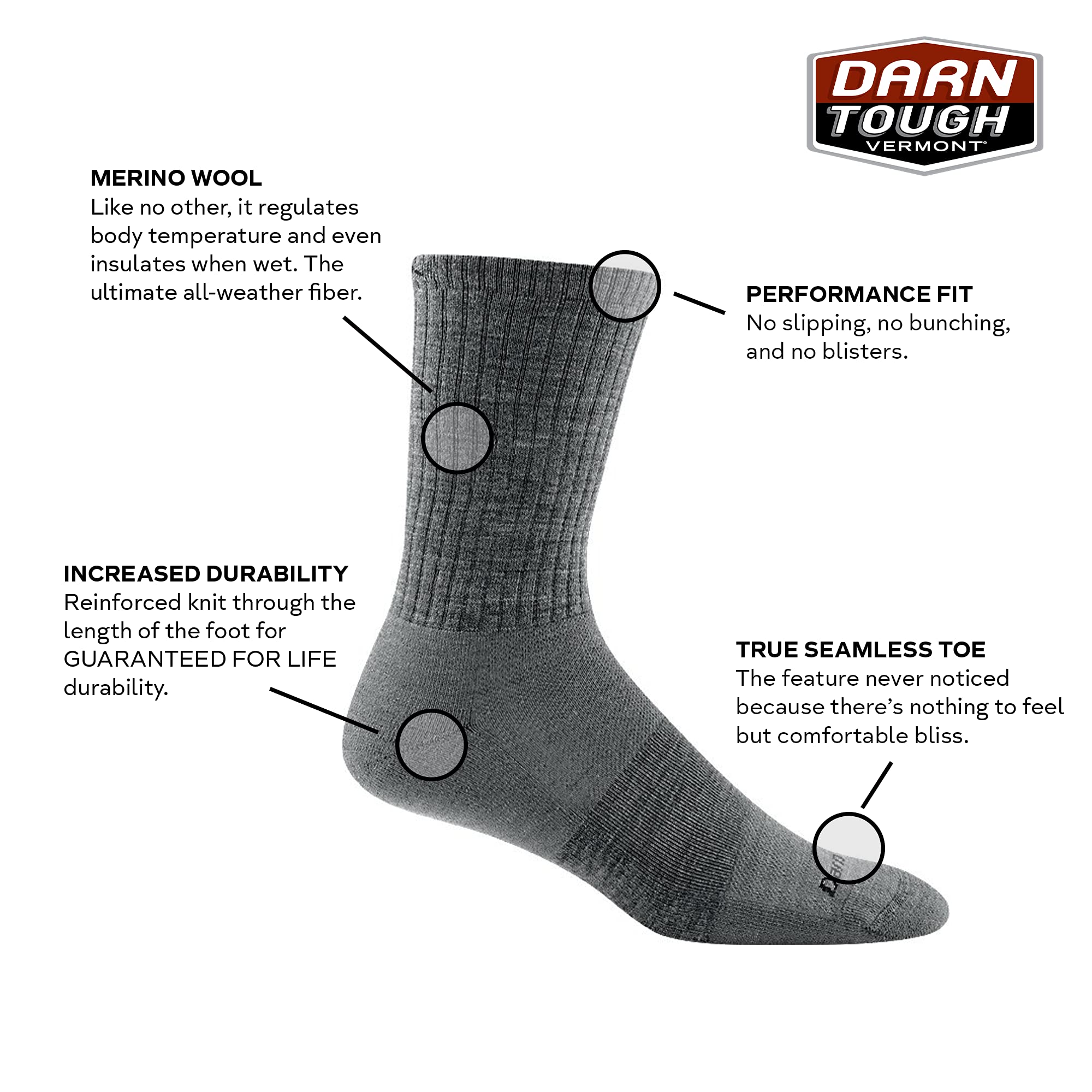 Guaranteed for Life - If these socks wear, tear, or develop holes, Darn Tough will replace them. No strings. No conditions.
