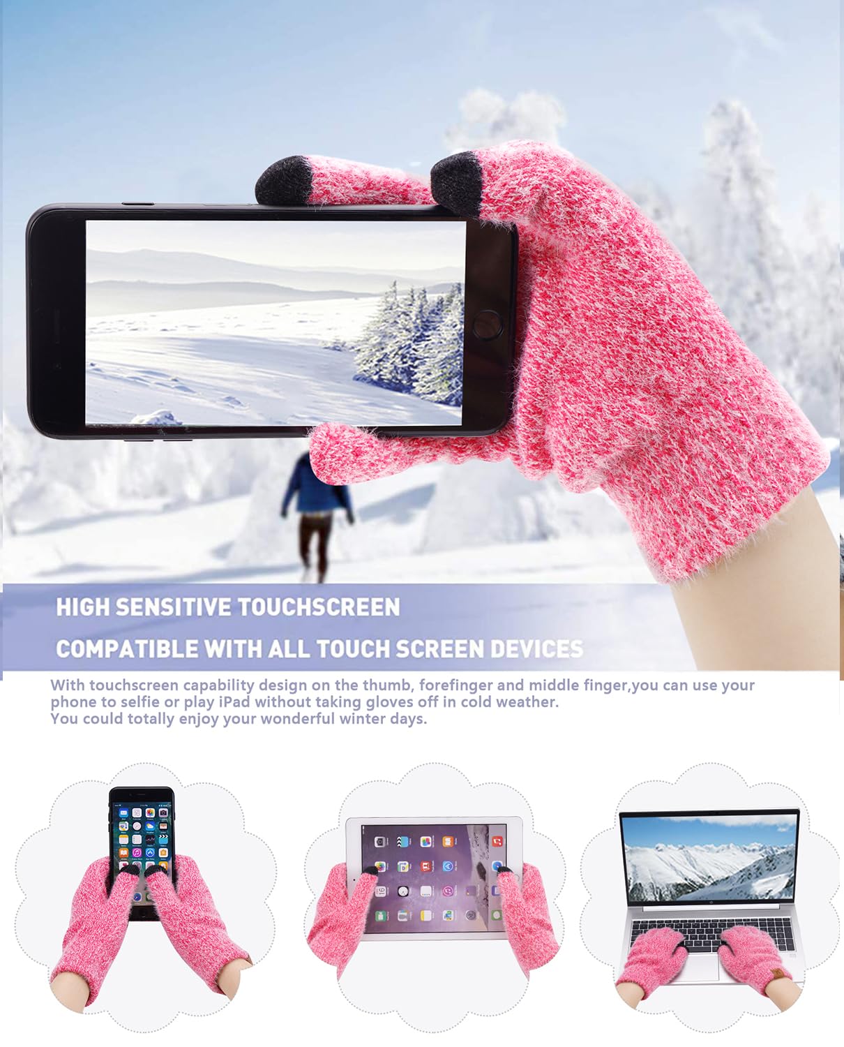 【High Sensitive Touch Screen Gloves】Double layers touchscreen sensitive materials on 3 fingers (thumbs, forefinger and middle finger), enjoy using smartphone, tablet, texting, driving in extreme cold weather.