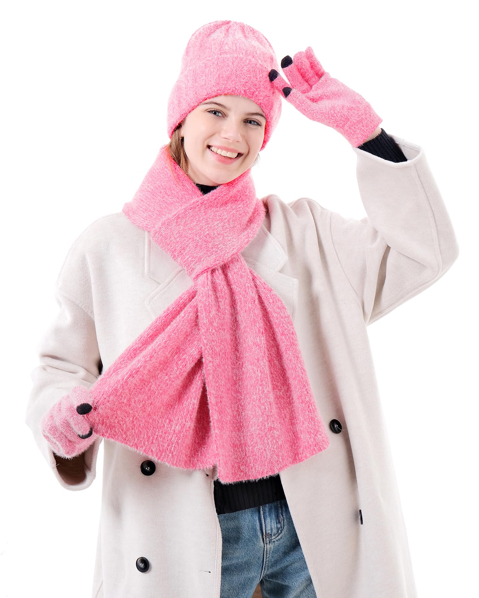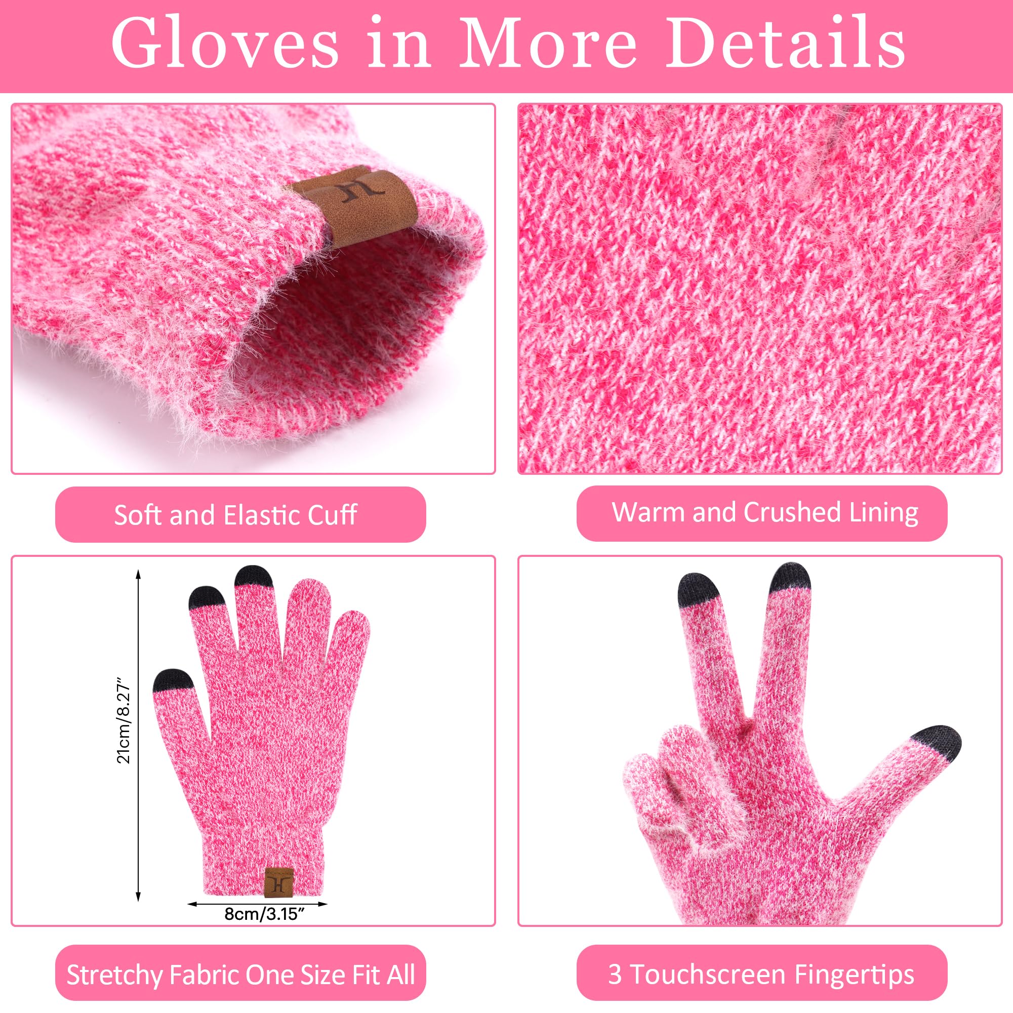 【Classic Style Knitted Hat Scarf Gloves Suits】Precise knitting crafts creates a beautiful and fashionable design that can be matched with most formal and casual clothing. Wonderful for women wearing while skiing, skating, sledding, camping, driving or any outdoor winter sports and daily use. Package Included: 1× Winter Beanie Hat + 1× Touchscreen Gloves + 1× Long Scarf (3 in 1 set);