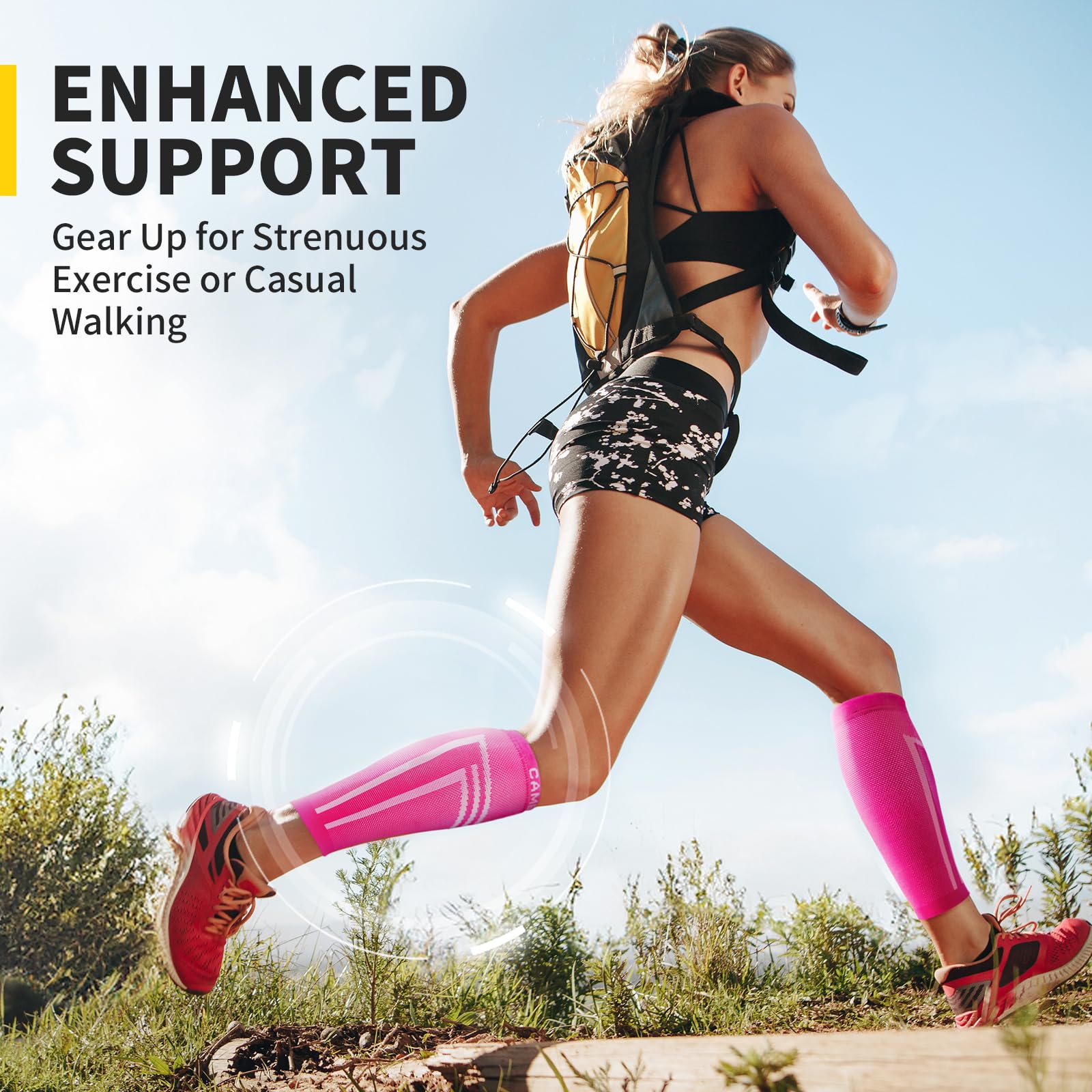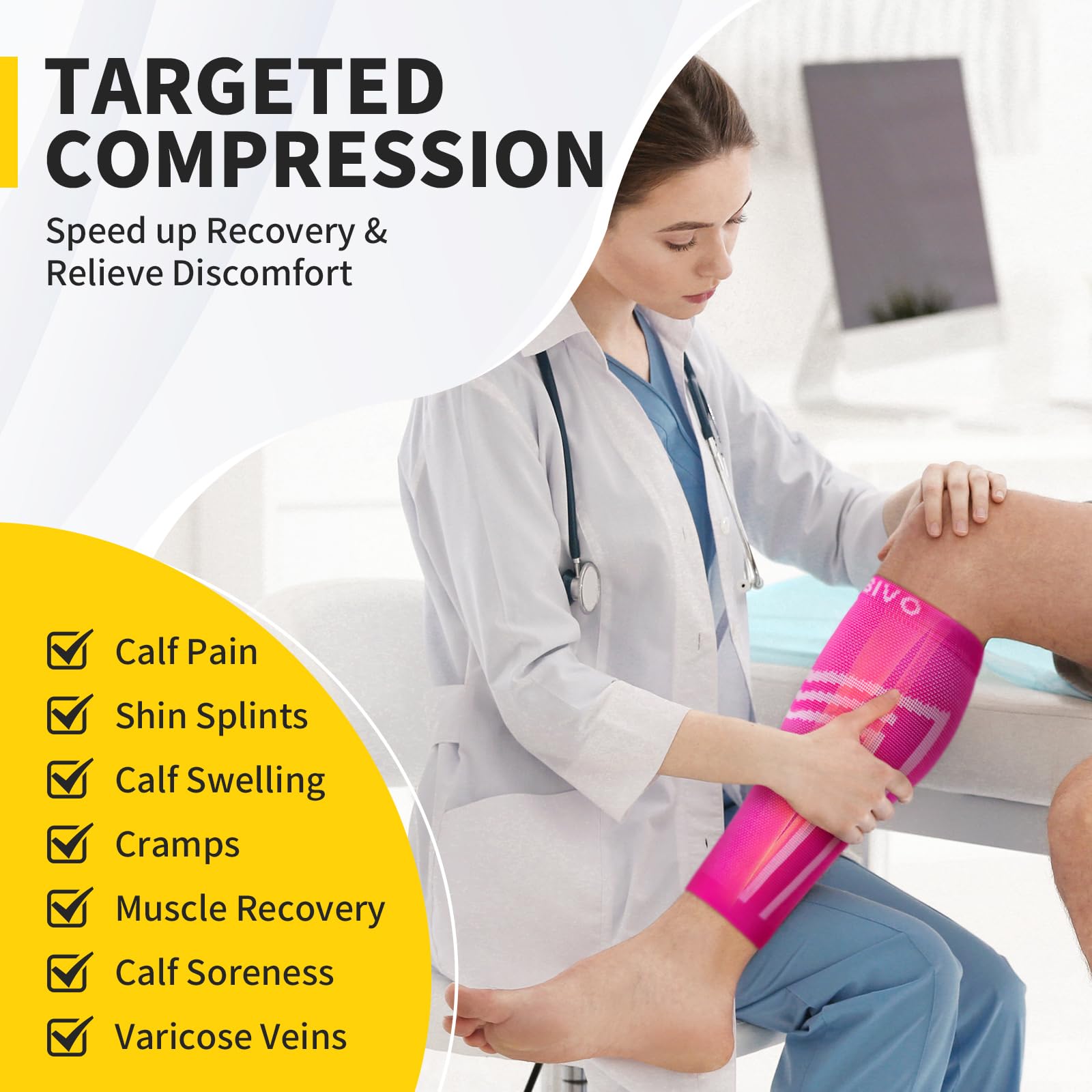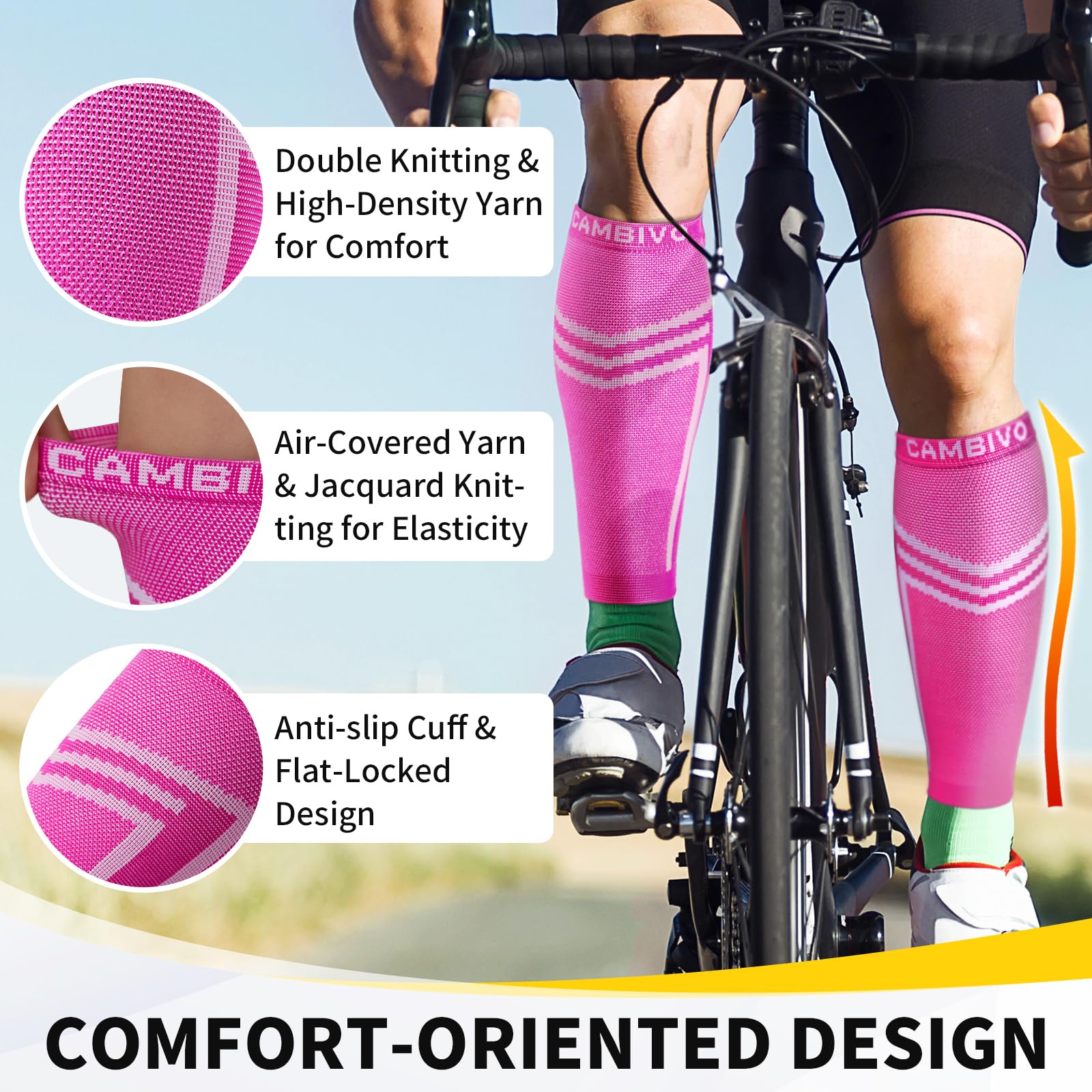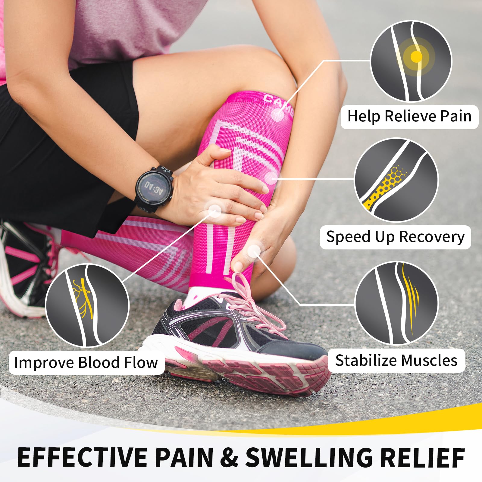 Graduated Compression: Cambivo leg compression sleeve applies graduated pressure to the calf, shin, and Achilles, providing extra support to keep your muscles working well; these shin splint compression sleeves fight gravity and boost circulation by increasing the velocity of venous blood flow back to the heart; the compression sleeves for legs help support weak calves and soothe calf pain caused by shin splints, varicose veins, stiffness, Achilles tendinitis, swelling, cramps, and fatigue.