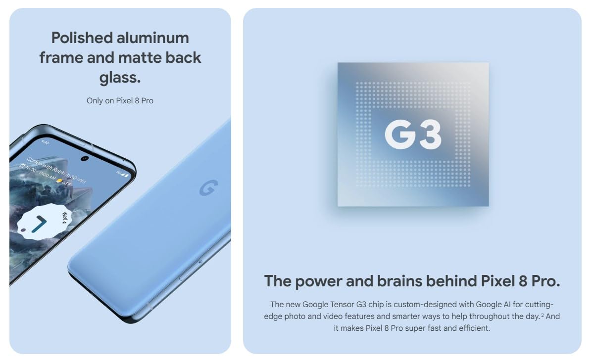 Product description PRODUCT OVERVIEWIntroducing Pixel 8 Pro, the all-pro phone engineered by Google. It’s sleek, sophisticated, powerful, and secure. With Google AI, you can do more, even faster. The triple camera system includes a dedicated 5x telephoto lens, improved autofocus, and full-resolution photography with Pro controls. And the all-day battery charges faster than ever. KEY FEATURESThe power behind Google AI and Pixel 8 Pro - The new Google Tensor G3 chip is built with Google AI for cutting-edge photo and video features and smarter ways to help. And it makes Pixel super fast and efficient.Pixel’s best pro camera yet - Pixel 8 Pro has four updated pro-level cameras with Pixel's best zoom ever. And Pro controls unlock advanced settings and support full-resolution images.Brilliant display, inside and out - The immersive 6.7-inch display makes everything sharp. And the refresh rate intelligently adjusts between 1 and 120Hz for responsive performance.Circle to Search: A super easy way to search. - Circle to search anything right from the app you’re in. Just draw a circle with your finger around an image, text, or video, and Google AI finds it fast.Pixel’s super dependable, all-day battery - The Adaptive Battery can last over 24 hours. Turn on Extreme Battery Saver, and it can last up to 72 hours. And it charges faster than ever.Powered by Android. And it's easy to switch to Pixel - Transfer your contacts, photos, messages, and more. And Pixel already comes with your favorite Google apps.Video sounds even better, just like that - Audio Magic Eraser uses Google AI to reduce disruptive noises like cars and wind and highlight the sounds you want.Group pics, perfected - Did someone blink or look away? Pixel’s Best Take combines similar photos into one fantastic picture where everyone looks their best.Security you can depend on - With Google Tensor G3 and the Titan M2 security chip, Pixel is built with layers of security to help keep your info safe. Set Contains: charging cable