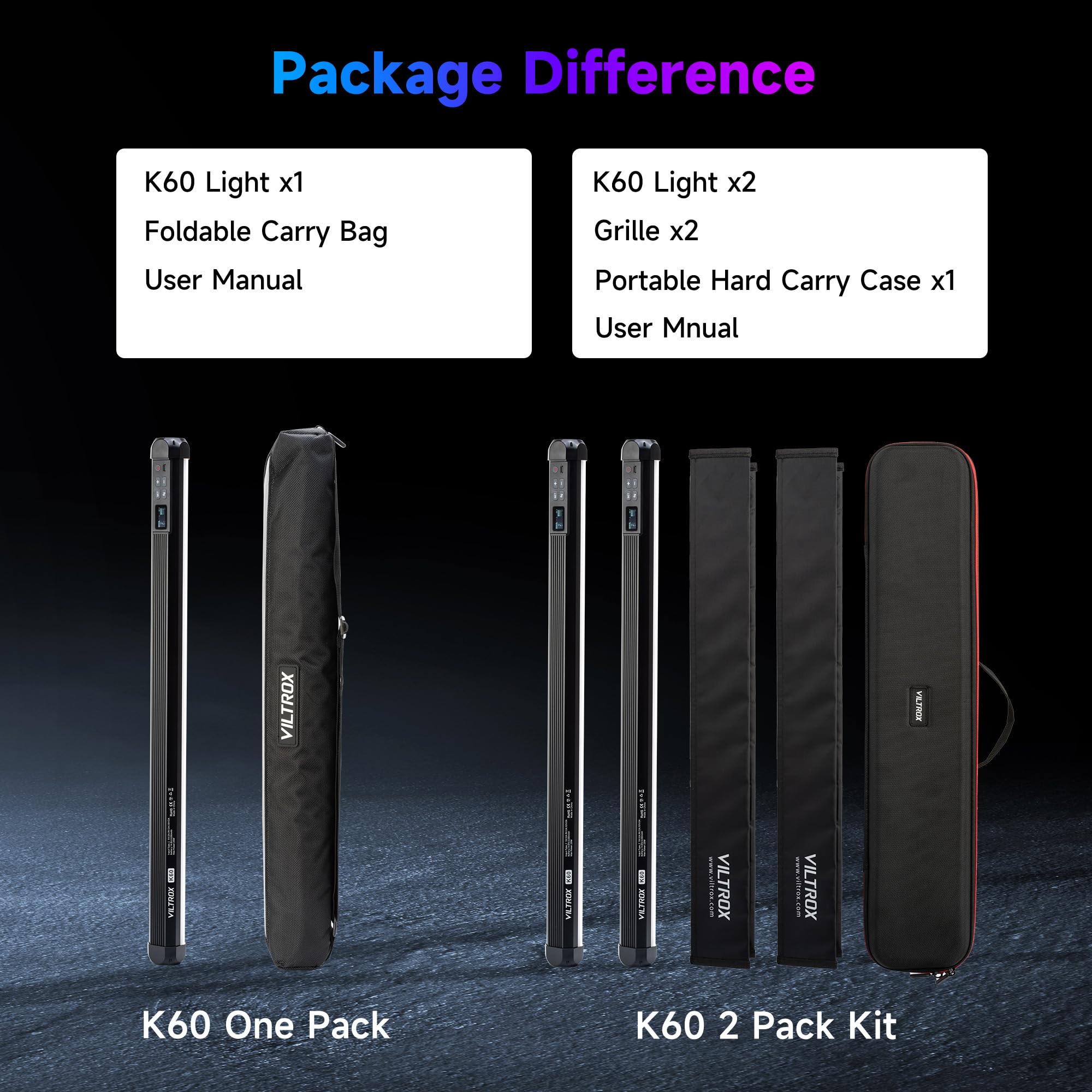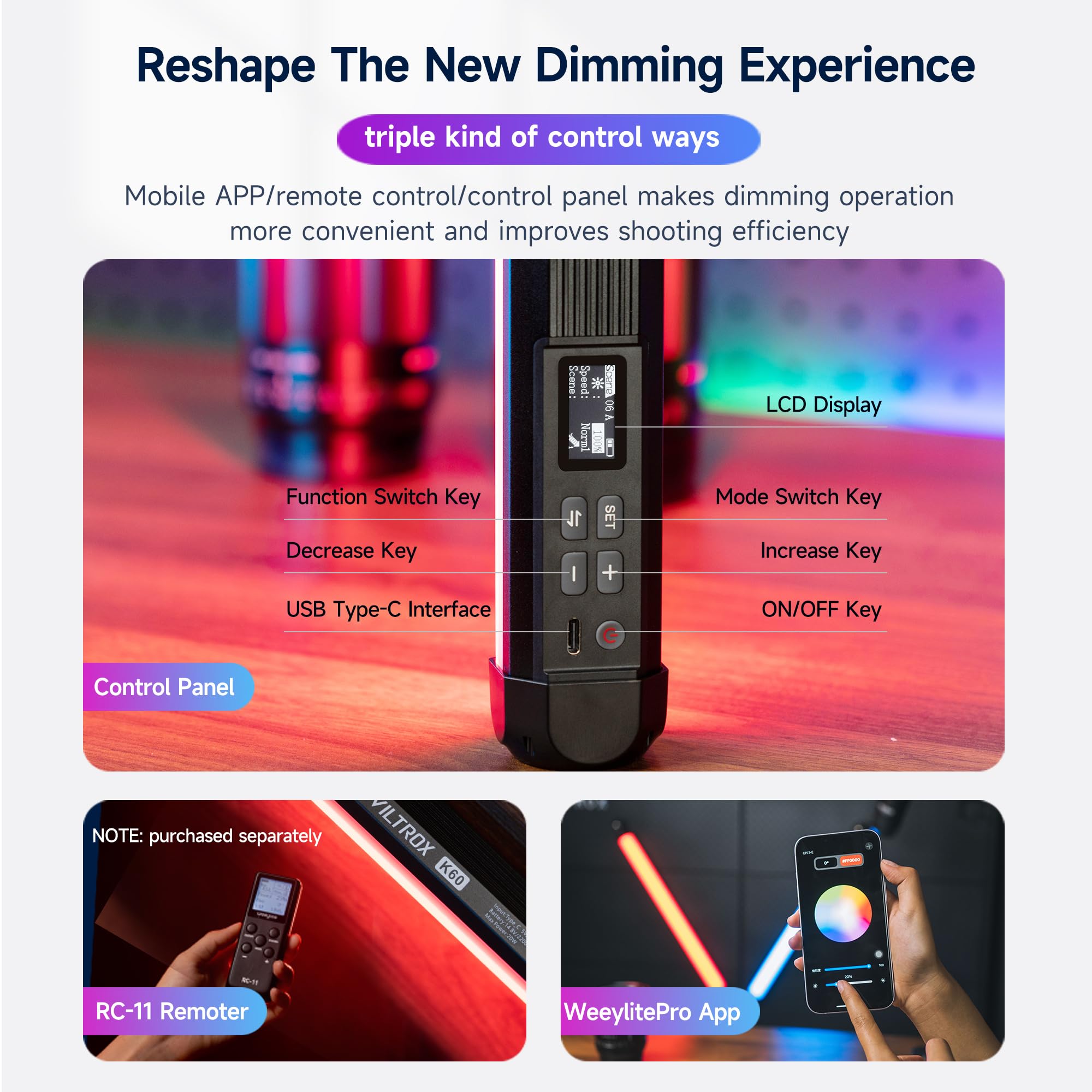 【App Control RGB Light Wand】Built-in 2.4G wireless system makes the K60 light stick can wirelessly control and easily switch various scene modes via "weeylitePro” app and "weeylite RC-11" remote control(NOT INCLUDED), even combined with other VILTROX lights to get your ideal color and special effects. Also the intuitive on body control are easy to use, even for a new photographer.